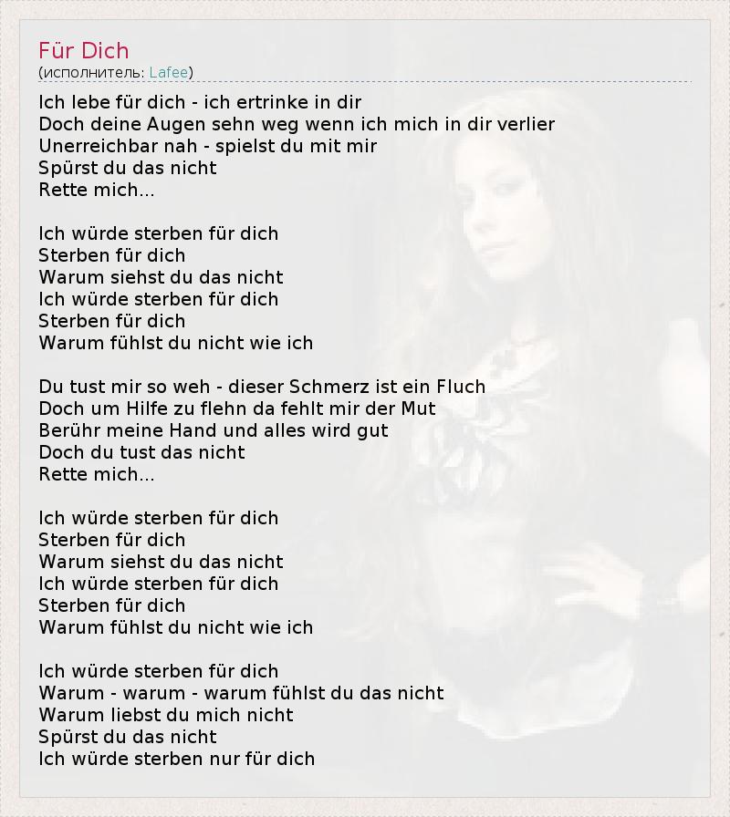 Ich lebe für dich - ich ertrinke in dir Doch deine Augen sehn weg wenn ich mich in dir verlier Unerreichbar nah - spielst du mit mir Spürst du das nicht Rette mich... Ich würde sterben für dich Sterben für dich Warum siehst du das nicht Ich würde sterben für dich Sterben für dich Warum fühlst du nicht wie ich Du tust mir so weh - dieser Schmerz ist ein Fluch Doch um Hilfe zu flehn da fehlt mir der Mut Berühr meine Hand und alles wird gut Doch du tust das nicht Rette mich... Ich würde sterben für dich Sterben für dich Warum siehst du das nicht Ich würde sterben für dich Sterben für dich Warum fühlst du nicht wie ich Ich würde sterben für dich Warum - warum - warum fühlst du das nicht Warum liebst du mich nicht Spürst du das nicht Ich würde sterben nur für dich