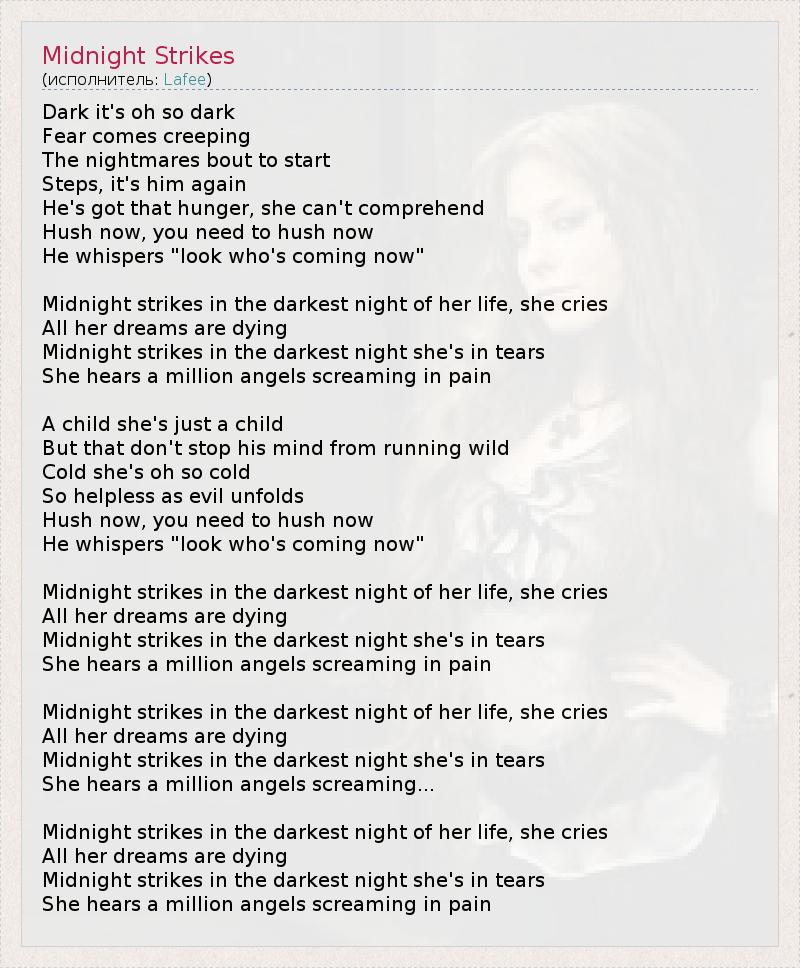Темно, так темно, Страх заползает в душу, Охватывает ужас... Шаги, это снова он, Он чувствует жажду, но она не может этого понять. Замолчи, ты должна умолкнуть. Он шепчет: «Посмотри, кто идёт...» Часы бьют полночь самой тёмной ночи её жизни... Она плачет, Все её мечты умирают.... Часы бьют полночь самой тёмной ночи её жизни... она в слезах, Она слышит, как миллион ангелов кричат от боли... Ребёнок, она только ребёнок, Но это не останавливает его дикий разум Холодно, ей так холодно, Она так беспомощна перед появлением зла. Замолчи, ты должна умолкнуть. Он шепчет: «Посмотри, кто идёт...» Часы бьют полночь самой тёмной ночи её жизни... Она плачет, Все её мечты умирают.... Часы бьют полночь самой тёмной ночи её жизни... она в слезах, Она слышит, как миллион ангелов кричат от боли... Часы бьют полночь самой тёмной ночи её жизни... Она плачет, Все её мечты умирают.... Часы бьют полночь самой тёмной ночи её жизни... она в слезах, Она слышит, как миллион ангелов кричат... Часы бьют полночь самой тёмной ночи её жизни... Она плачет, Все её мечты умирают.... Часы бьют полночь самой тёмной ночи её жизни... она в слезах, Она слышит, как миллион ангелов кричат от боли...