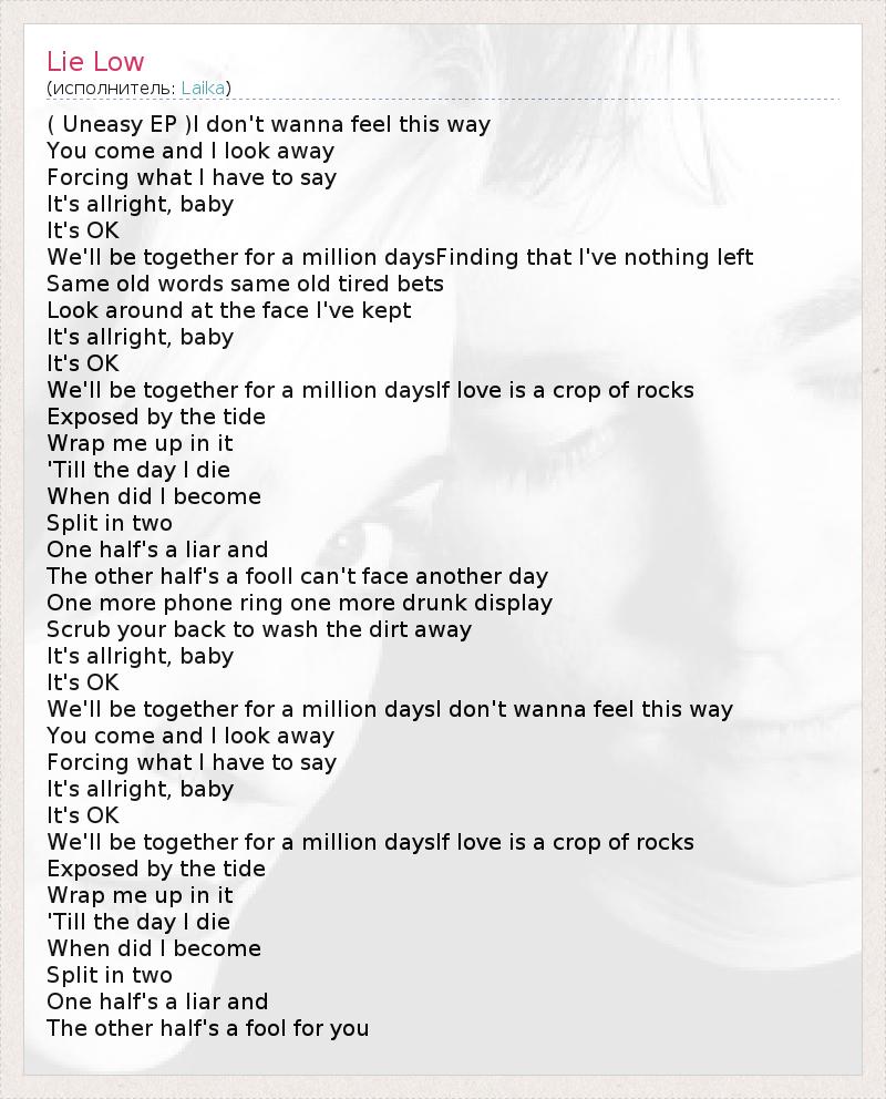 ( Uneasy EP )I don't wanna feel this way You come and I look away Forcing what I have to say It's allright, baby It's OK We'll be together for a million daysFinding that I've nothing left Same old words same old tired bets Look around at the face I've kept It's allright, baby It's OK We'll be together for a million daysIf love is a crop of rocks Exposed by the tide Wrap me up in it 'Till the day I die When did I become Split in two One half's a liar and The other half's a foolI can't face another day One more phone ring one more drunk display Scrub your back to wash the dirt away It's allright, baby It's OK We'll be together for a million daysI don't wanna feel this way You come and I look away Forcing what I have to say It's allright, baby It's OK We'll be together for a million daysIf love is a crop of rocks Exposed by the tide Wrap me up in it 'Till the day I die When did I become Split in two One half's a liar and The other half's a fool for you