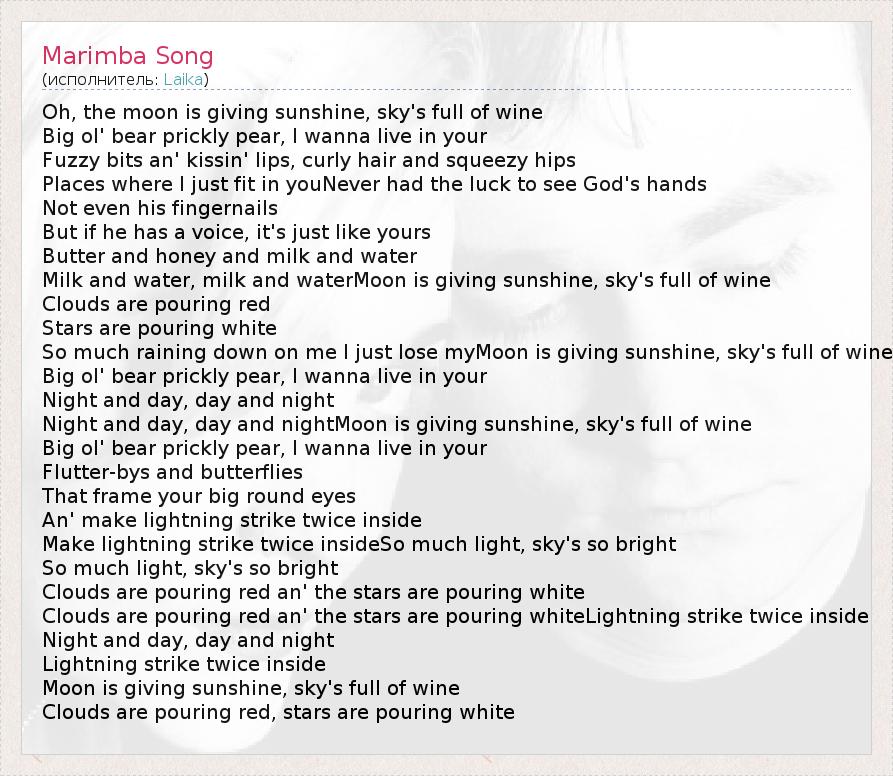 Oh, the moon is giving sunshine, sky's full of wine Big ol' bear prickly pear, I wanna live in your Fuzzy bits an' kissin' lips, curly hair and squeezy hips Places where I just fit in youNever had the luck to see God's hands Not even his fingernails But if he has a voice, it's just like yours Butter and honey and milk and water Milk and water, milk and waterMoon is giving sunshine, sky's full of wine Clouds are pouring red Stars are pouring white So much raining down on me I just lose myMoon is giving sunshine, sky's full of wine Big ol' bear prickly pear, I wanna live in your Night and day, day and night Night and day, day and nightMoon is giving sunshine, sky's full of wine Big ol' bear prickly pear, I wanna live in your Flutter-bys and butterflies That frame your big round eyes An' make lightning strike twice inside Make lightning strike twice insideSo much light, sky's so bright So much light, sky's so bright Clouds are pouring red an' the stars are pouring white Clouds are pouring red an' the stars are pouring whiteLightning strike twice inside Night and day, day and night Lightning strike twice inside Moon is giving sunshine, sky's full of wine Clouds are pouring red, stars are pouring white