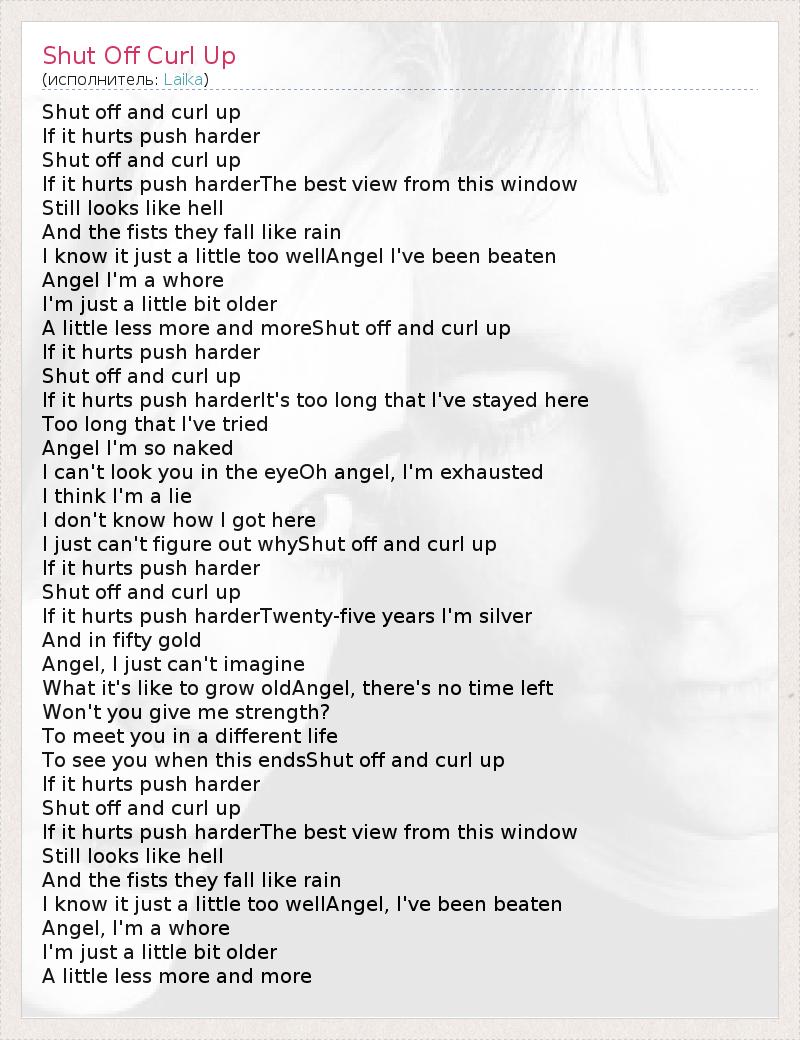 Shut off and curl up If it hurts push harder Shut off and curl up If it hurts push harderThe best view from this window Still looks like hell And the fists they fall like rain I know it just a little too wellAngel I've been beaten Angel I'm a whore I'm just a little bit older A little less more and moreShut off and curl up If it hurts push harder Shut off and curl up If it hurts push harderIt's too long that I've stayed here Too long that I've tried Angel I'm so naked I can't look you in the eyeOh angel, I'm exhausted I think I'm a lie I don't know how I got here I just can't figure out whyShut off and curl up If it hurts push harder Shut off and curl up If it hurts push harderTwenty-five years I'm silver And in fifty gold Angel, I just can't imagine What it's like to grow oldAngel, there's no time left Won't you give me strength? To meet you in a different life To see you when this endsShut off and curl up If it hurts push harder Shut off and curl up If it hurts push harderThe best view from this window Still looks like hell And the fists they fall like rain I know it just a little too wellAngel, I've been beaten Angel, I'm a whore I'm just a little bit older A little less more and more