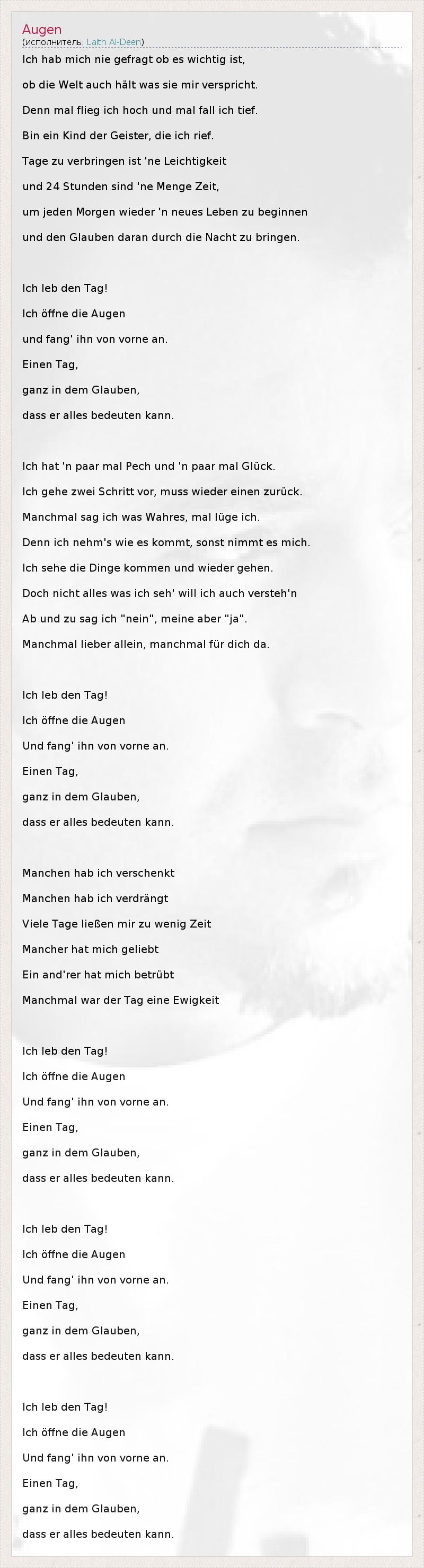 Ich hab mich nie gefragt ob es wichtig ist, ob die Welt auch hält was sie mir verspricht. Denn mal flieg ich hoch und mal fall ich tief. Bin ein Kind der Geister, die ich rief. Tage zu verbringen ist 'ne Leichtigkeit und 24 Stunden sind 'ne Menge Zeit, um jeden Morgen wieder 'n neues Leben zu beginnen und den Glauben daran durch die Nacht zu bringen. Ich leb den Tag! Ich öffne die Augen und fang' ihn von vorne an. Einen Tag, ganz in dem Glauben, dass er alles bedeuten kann. Ich hat 'n paar mal Pech und 'n paar mal Glück. Ich gehe zwei Schritt vor, muss wieder einen zurück. Manchmal sag ich was Wahres, mal lüge ich. Denn ich nehm's wie es kommt, sonst nimmt es mich. Ich sehe die Dinge kommen und wieder gehen. Doch nicht alles was ich seh' will ich auch versteh'n Ab und zu sag ich "nein", meine aber "ja". Manchmal lieber allein, manchmal für dich da. Ich leb den Tag! Ich öffne die Augen Und fang' ihn von vorne an. Einen Tag, ganz in dem Glauben, dass er alles bedeuten kann. Manchen hab ich verschenkt Manchen hab ich verdrängt Viele Tage ließen mir zu wenig Zeit Mancher hat mich geliebt Ein and'rer hat mich betrübt Manchmal war der Tag eine Ewigkeit Ich leb den Tag! Ich öffne die Augen Und fang' ihn von vorne an. Einen Tag, ganz in dem Glauben, dass er alles bedeuten kann. Ich leb den Tag! Ich öffne die Augen Und fang' ihn von vorne an. Einen Tag, ganz in dem Glauben, dass er alles bedeuten kann. Ich leb den Tag! Ich öffne die Augen Und fang' ihn von vorne an. Einen Tag, ganz in dem Glauben, dass er alles bedeuten kann.