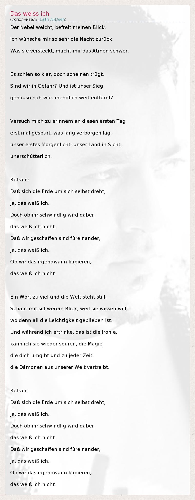 Der Nebel weicht, befreit meinen Blick. Ich wünsche mir so sehr die Nacht zurück. Was sie versteckt, macht mir das Atmen schwer. Es schien so klar, doch scheinen trügt. Sind wir in Gefahr? Und ist unser Sieg genauso nah wie unendlich weit entfernt? Versuch mich zu erinnern an diesen ersten Tag erst mal gespürt, was lang verborgen lag, unser erstes Morgenlicht, unser Land in Sicht, unerschütterlich. Refrain: Daß sich die Erde um sich selbst dreht, ja, das weiß ich. Doch ob ihr schwindlig wird dabei, das weiß ich nicht. Daß wir geschaffen sind füreinander, ja, das weiß ich. Ob wir das irgendwann kapieren, das weiß ich nicht. Ein Wort zu viel und die Welt steht still, Schaut mit schwerem Blick, weil sie wissen will, wo denn all die Leichtigkeit geblieben ist. Und während ich ertrinke, das ist die Ironie , kann ich sie wieder spüren, die Magie, die dich umgibt und zu jeder Zeit die Dämonen aus unserer Welt vertreibt. Refrain: Daß sich die Erde um sich selbst dreht, ja, das weiß ich. Doch ob ihr schwindlig wird dabei, das weiß ich nicht. Daß wir geschaffen sind füreinander, ja, das weiß ich. Ob wir das irgendwann kapieren, das weiß ich nicht.