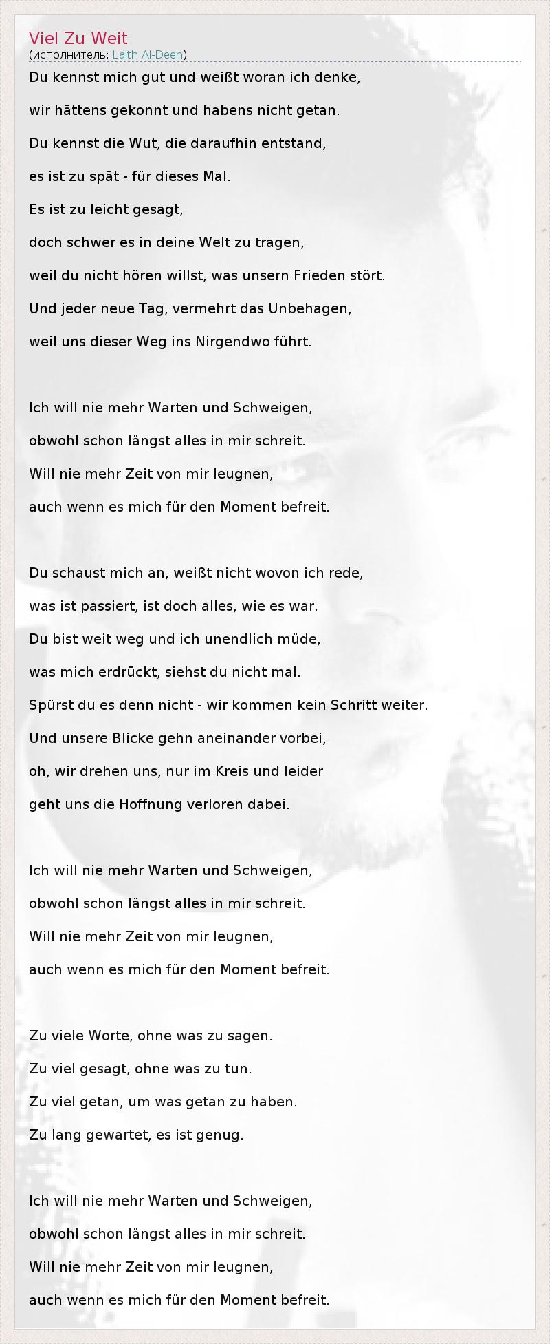 Du kennst mich gut und weißt woran ich denke, wir hättens gekonnt und habens nicht getan. Du kennst die Wut, die daraufhin entstand, es ist zu spät - für dieses Mal. Es ist zu leicht gesagt, doch schwer es in deine Welt zu tragen, weil du nicht hören willst, was unsern Frieden stört. Und jeder neue Tag, vermehrt das Unbehagen, weil uns dieser Weg ins Nirgendwo führt. Ich will nie mehr Warten und Schweigen, obwohl schon längst alles in mir schreit. Will nie mehr Zeit von mir leugnen, auch wenn es mich für den Moment befreit. Du schaust mich an, weißt nicht wovon ich rede, was ist passiert, ist doch alles, wie es war. Du bist weit weg und ich unendlich müde, was mich erdrückt, siehst du nicht mal. Spürst du es denn nicht - wir kommen kein Schritt weiter. Und unsere Blicke gehn aneinander vorbei, oh, wir drehen uns, nur im Kreis und leider geht uns die Hoffnung verloren dabei. Ich will nie mehr Warten und Schweigen, obwohl schon längst alles in mir schreit. Will nie mehr Zeit von mir leugnen, auch wenn es mich für den Moment befreit. Zu viele Worte, ohne was zu sagen. Zu viel gesagt, ohne was zu tun. Zu viel getan, um was getan zu haben. Zu lang gewartet, es ist genug. Ich will nie mehr Warten und Schweigen, obwohl schon längst alles in mir schreit. Will nie mehr Zeit von mir leugnen, auch wenn es mich für den Moment befreit.