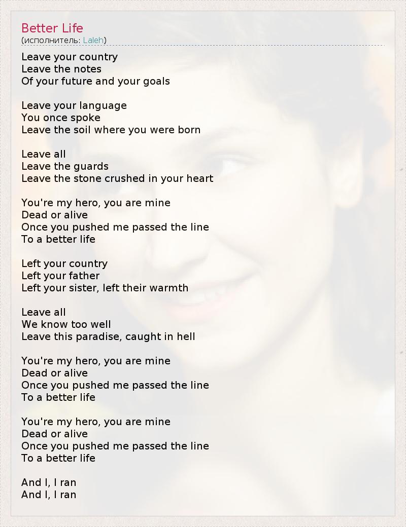 Leave your country Leave the notes Of your future and your goals Leave your language You once spoke Leave the soil where you were born Leave all Leave the guards Leave the stone crushed in your heart You're my hero, you are mine Dead or alive Once you pushed me passed the line To a better life Left your country Left your father Left your sister, left their warmth Leave all We know too well Leave this paradise, caught in hell You're my hero, you are mine Dead or alive Once you pushed me passed the line To a better life You're my hero, you are mine Dead or alive Once you pushed me passed the line To a better life And I, I ran And I, I ran