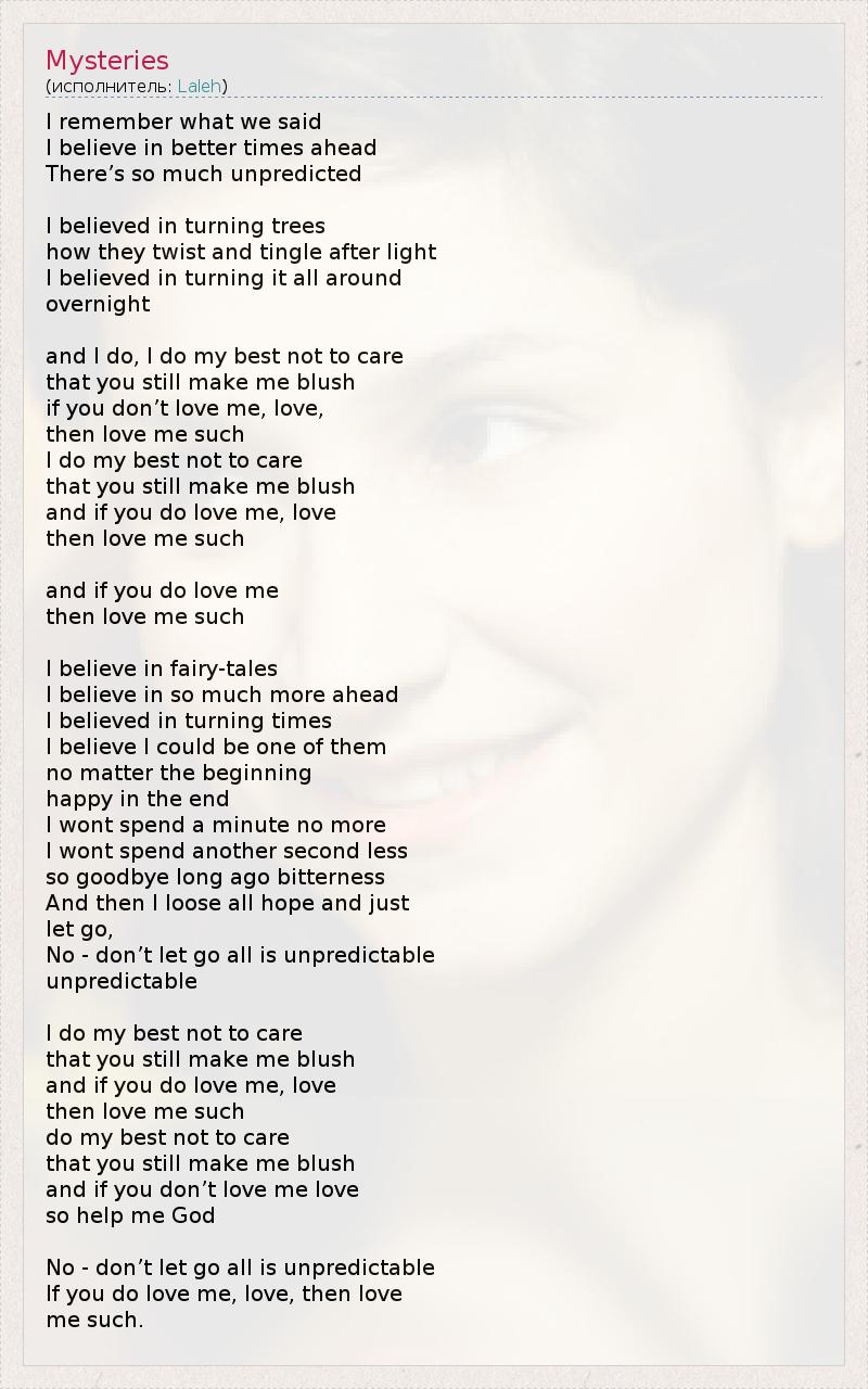 I remember what we said I believe in better times ahead There’s so much unpredicted I believed in turning trees how they twist and tingle after light I believed in turning it all around overnight and I do, I do my best not to care that you still make me blush if you don’t love me, love, then love me such I do my best not to care that you still make me blush and if you do love me, love then love me such and if you do love me then love me such I believe in fairy-tales I believe in so much more ahead I believed in turning times I believe I could be one of them no matter the beginning happy in the end I wont spend a minute no more I wont spend another second less so goodbye long ago bitterness And then I loose all hope and just let go, No - don’t let go all is unpredictable unpredictable I do my best not to care that you still make me blush and if you do love me, love then love me such do my best not to care that you still make me blush and if you don’t love me love so help me God No - don’t let go all is unpredictable If you do love me, love, then love me such.