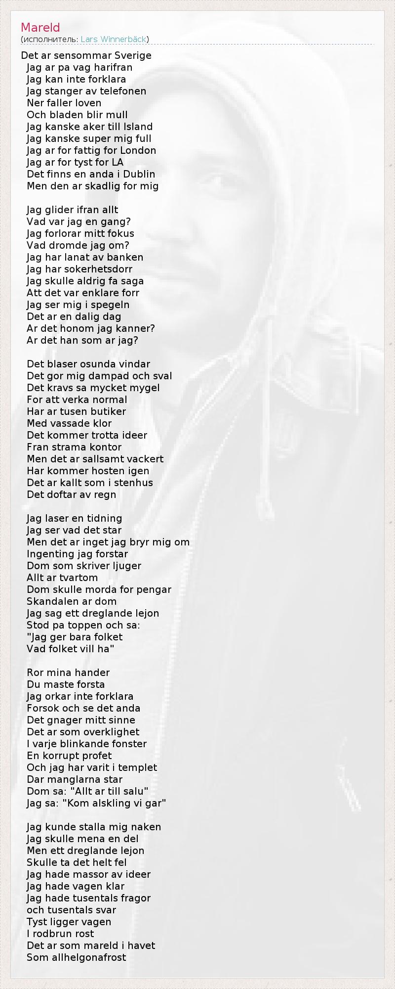 Это интересно:Lars Winnerbäck — один из самых популярных шведских singers/songwriters последней декады. Оттолкнувшись от звука поп-фолка, Ларс приблизился року поздних 90-х. В своей самой недавней работе Ларс снова вернулся к акустическому звучанию. Родившись в городе Linköping, Ларс уехал в Стокгольм, где и достиг успеха в музыкальной карьере. Оба города часто отражаются в текстах его песен.