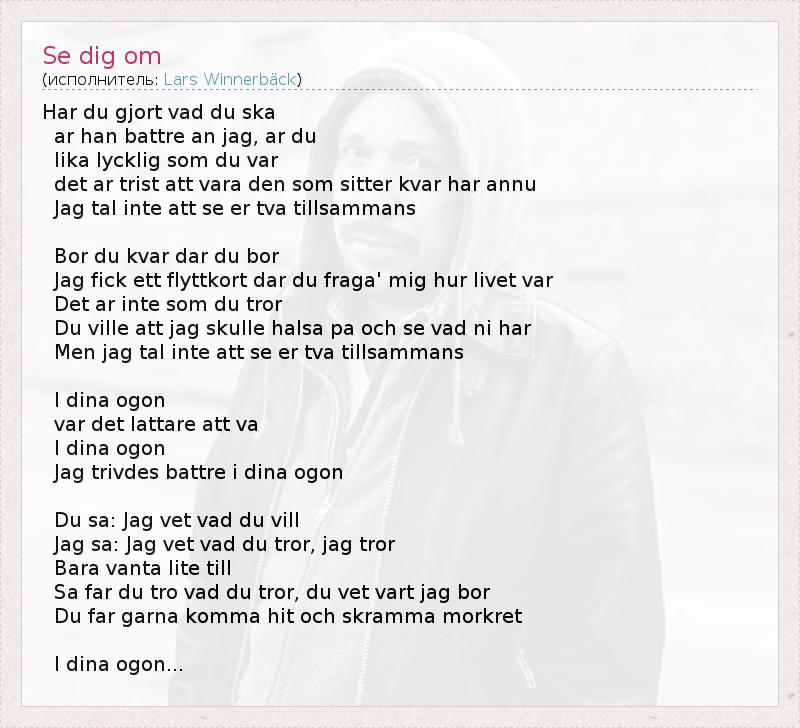 Это интересно:Lars Winnerbäck — один из самых популярных шведских singers/songwriters последней декады. Оттолкнувшись от звука поп-фолка, Ларс приблизился року поздних 90-х. В своей самой недавней работе Ларс снова вернулся к акустическому звучанию. Родившись в городе Linköping, Ларс уехал в Стокгольм, где и достиг успеха в музыкальной карьере. Оба города часто отражаются в текстах его песен.