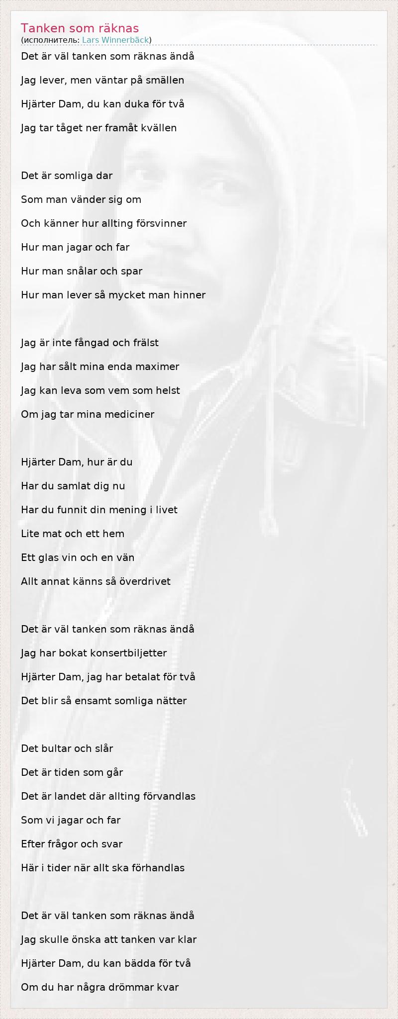 Это интересно:Lars Winnerbäck — один из самых популярных шведских singers/songwriters последней декады. Оттолкнувшись от звука поп-фолка, Ларс приблизился року поздних 90-х. В своей самой недавней работе Ларс снова вернулся к акустическому звучанию. Родившись в городе Linköping, Ларс уехал в Стокгольм, где и достиг успеха в музыкальной карьере. Оба города часто отражаются в текстах его песен.