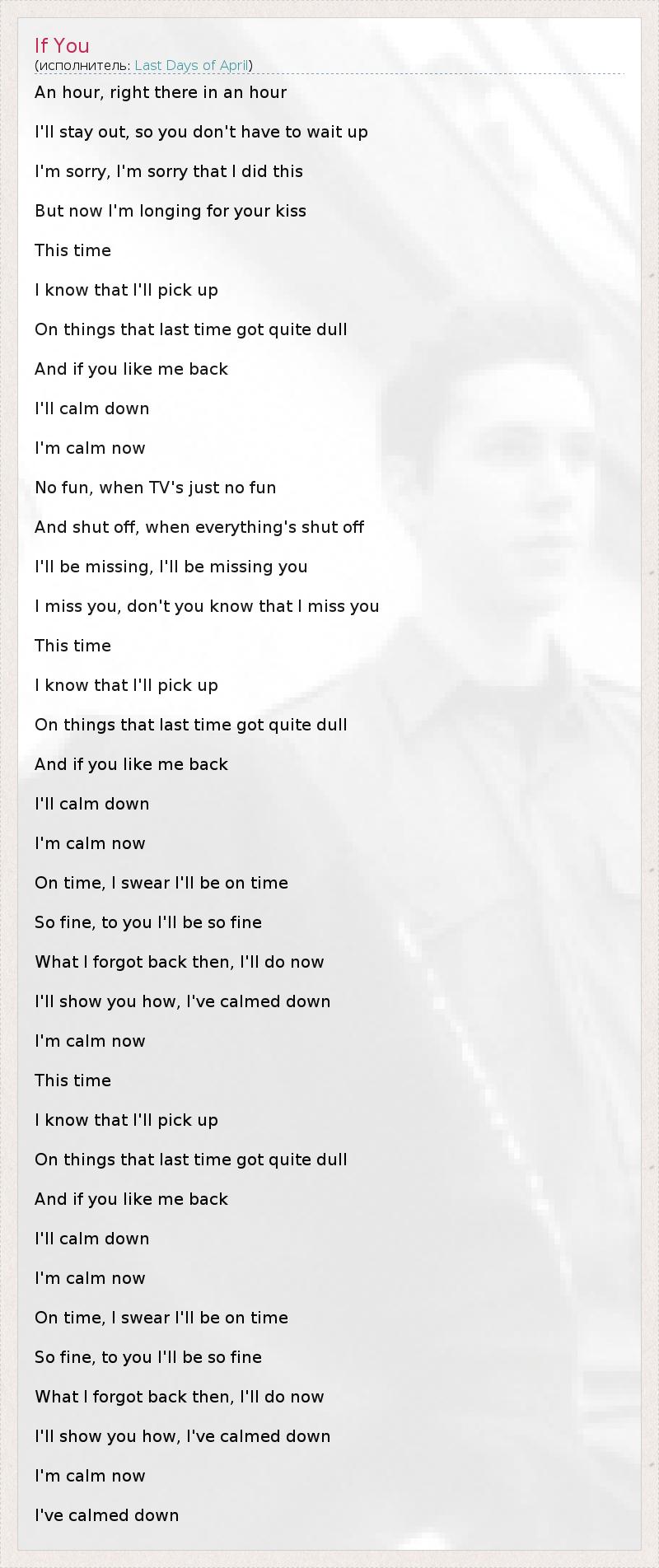 Это интересно:Группа была основана в 1996 году в Стокгольме. Дебютный одноименный альбом шведской группы "Last Days Of April" вышел в 1997 году, и если сравнить его с последней работой - “Might As Well Live" - можно подумать, что это 2 совершенно разные группы, мало похожие друг на друга. Сама же группа утверждает, что это именно то звучание, к которому они шли 8 лет.В 1998 году группа подписала контракт с Bad Taste Records... продолжение