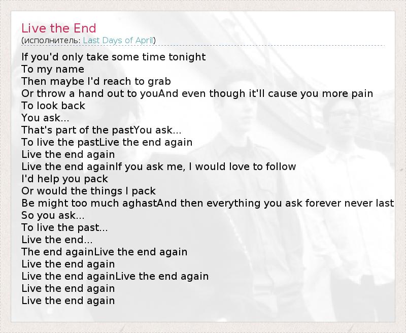 Это интересно:Группа была основана в 1996 году в Стокгольме. Дебютный одноименный альбом шведской группы "Last Days Of April" вышел в 1997 году, и если сравнить его с последней работой - “Might As Well Live" - можно подумать, что это 2 совершенно разные группы, мало похожие друг на друга. Сама же группа утверждает, что это именно то звучание, к которому они шли 8 лет.В 1998 году группа подписала контракт с Bad Taste Records... продолжение
