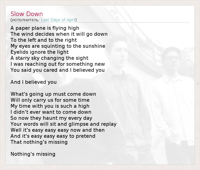 A paper plane is flying high The wind decides when it will go down To the left and to the right My eyes are squinting to the sunshine Eyelids ignore the light A starry sky changing the sight I was reaching out for something new You said you cared and I believed you And I believed you What's going up must come down Will only carry us for some time My time with you is such a high I didn't ever want to come down So now they haunt my every day Your words will sit and glimpse and replay Well it's easy easy easy now and then And it's easy easy easy to pretend That nothing's missing Nothing's missing