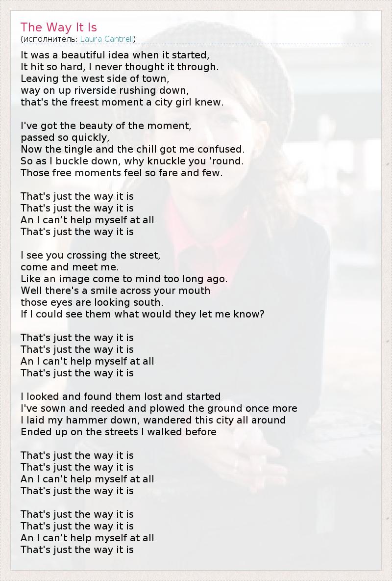 It was a beautiful idea when it started, It hit so hard, I never thought it through. Leaving the west side of town, way on up riverside rushing down, that's the freest moment a city girl knew. I've got the beauty of the moment, passed so quickly, Now the tingle and the chill got me confused. So as I buckle down, why knuckle you 'round. Those free moments feel so fare and few. That's just the way it is That's just the way it is An I can't help myself at all That's just the way it is I see you crossing the street, come and meet me. Like an image come to mind too long ago. Well there's a smile across your mouth those eyes are looking south. If I could see them what would they let me know? That's just the way it is That's just the way it is An I can't help myself at all That's just the way it is I looked and found them lost and started I've sown and reeded and plowed the ground once more I laid my hammer down, wandered this city all around Ended up on the streets I walked before That's just the way it is That's just the way it is An I can't help myself at all That's just the way it is That's just the way it is That's just the way it is An I can't help myself at all That's just the way it is