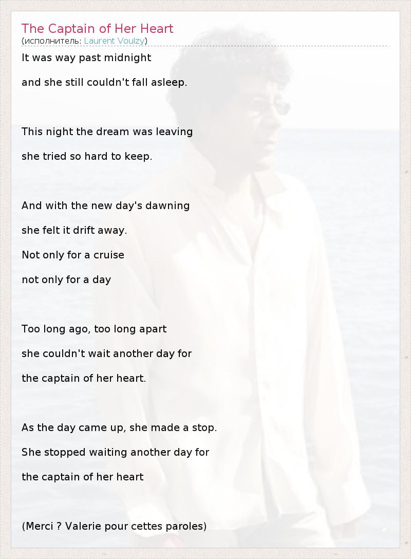 It was way past midnight and she still couldn't fall asleep. This night the dream was leaving she tried so hard to keep. And with the new day's dawning she felt it drift away. Not only for a cruise not only for a day Too long ago, too long apart she couldn't wait another day for the captain of her heart. As the day came up, she made a stop. She stopped waiting another day for the captain of her heart (Merci ? Valerie pour cettes paroles)