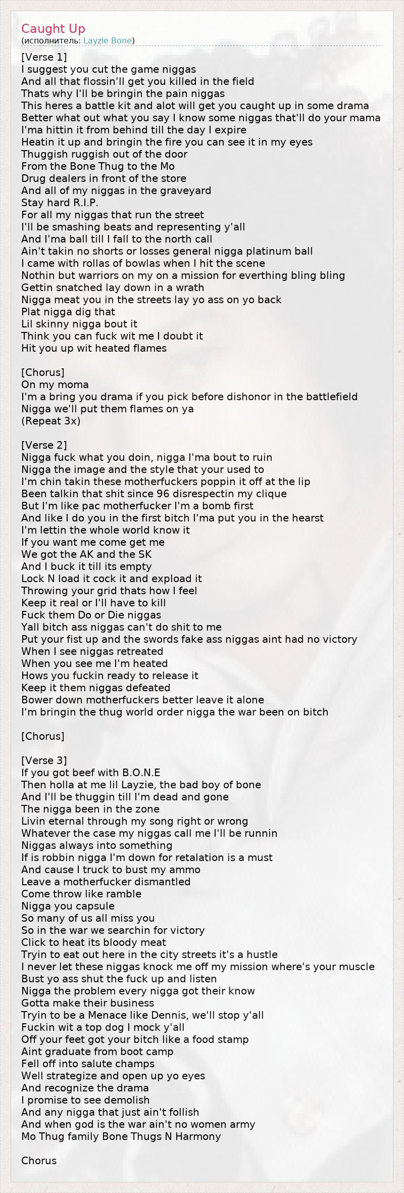 [Verse 1] I suggest you cut the game niggas And all that flossin'll get you killed in the field Thats why I'll be bringin the pain niggas This heres a battle kit and alot will get you caught up in some drama Better what out what you say I know some niggas that'll do your mama I'ma hittin it from behind till the day I expire Heatin it up and bringin the fire you can see it in my eyes Thuggish ruggish out of the door From the Bone Thug to the Mo Drug dealers in front of the store And all of my niggas in the graveyard Stay hard R.I.P. For all my niggas that run the street I'll be smashing beats and representing y'all And I'ma ball till I fall to the north call Ain't takin no shorts or losses general nigga platinum ball I came with rollas of bowlas when I hit the scene Nothin but warriors on my on a mission for everthing bling bling Gettin snatched lay down in a wrath Nigga meat you in the streets lay yo ass on yo back Plat nigga dig that Lil skinny nigga bout it Think you can fuck wit me I doubt it Hit you up wit heated flames [Chorus] On my moma I'm a bring you drama if you pick before dishonor in the battlefield Nigga we'll put them flames on ya (Repeat 3x) [Verse 2] Nigga fuck what you doin, nigga I'ma bout to ruin Nigga the image and the style that your used to I'm chin takin these motherfuckers poppin it off at the lip Been talkin that shit since 96 disrespectin my clique But I'm like pac motherfucker I'm a bomb first And like I do you in the first bitch I'ma put you in the hearst I'm lettin the whole world know it If you want me come get me We got the AK and the SK And I buck it till its empty Lock N load it cock it and expload it Throwing your grid thats how I feel Keep it real or I'll have to kill Fuck them Do or Die niggas Yall bitch ass niggas can't do shit to me Put your fist up and the swords fake ass niggas aint had no victory When I see niggas retreated When you see me I'm heated Hows you fuckin ready to release it Keep it them niggas defeated Bower down motherfuckers better leave it alone I'm bringin the thug world order nigga the war been on bitch [Chorus] [Verse 3] If you got beef with B.O.N.E Then holla at me lil Layzie, the bad boy of bone And I'll be thuggin till I'm dead and gone The nigga been in the zone Livin eternal through my song right or wrong Whatever the case my niggas call me I'll be runnin Niggas always into something If is robbin nigga I'm down for retalation is a must And cause I truck to bust my ammo Leave a motherfucker dismantled Come throw like ramble Nigga you capsule So many of us all miss you So in the war we searchin for victory Click to heat its bloody meat Tryin to eat out here in the city streets it's a hustle I never let these niggas knock me off my mission where's your muscle Bust yo ass shut the fuck up and listen Nigga the problem every nigga got their know Gotta make their business Tryin to be a Menace like Dennis, we'll stop y'all Fuckin wit a top dog I mock y'all Off your feet got your bitch like a food stamp Aint graduate from boot camp Fell off into salute champs Well strategize and open up yo eyes And recognize the drama I promise to see demolish And any nigga that just ain't follish And when god is the war ain't no women army Mo Thug family Bone Thugs N Harmony Chorus