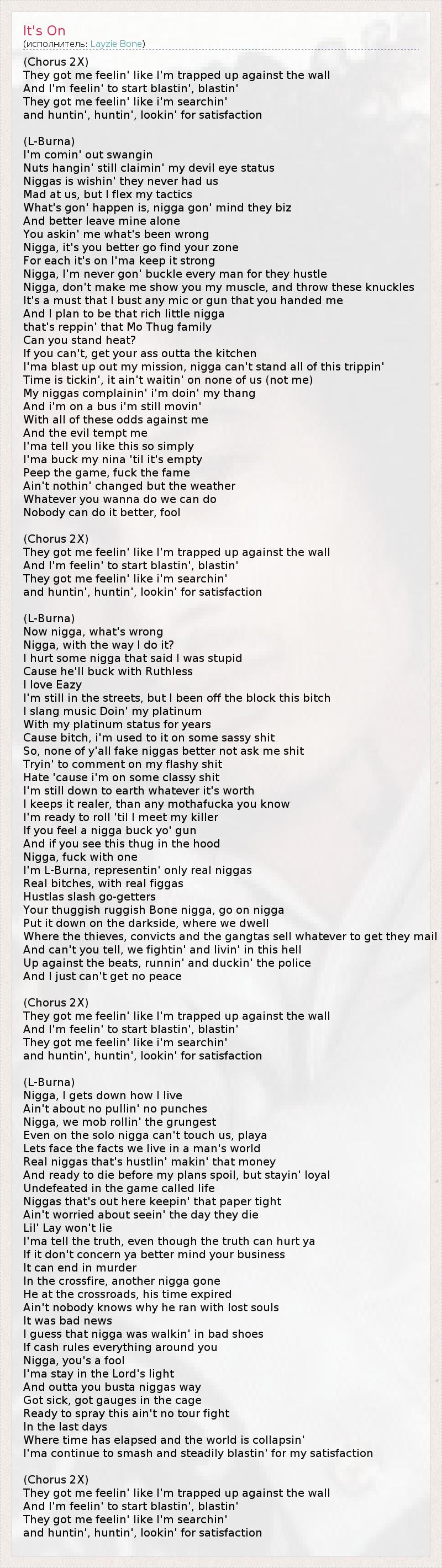 (Chorus 2X) They got me feelin' like I'm trapped up against the wall And I'm feelin' to start blastin', blastin' They got me feelin' like i'm searchin' and huntin', huntin', lookin' for satisfaction (L-Burna) I'm comin' out swangin Nuts hangin' still claimin' my devil eye status Niggas is wishin' they never had us Mad at us, but I flex my tactics What's gon' happen is, nigga gon' mind they biz And better leave mine alone You askin' me what's been wrong Nigga, it's you better go find your zone For each it's on I'ma keep it strong Nigga, I'm never gon' buckle every man for they hustle Nigga, don't make me show you my muscle, and throw these knuckles It's a must that I bust any mic or gun that you handed me And I plan to be that rich little nigga that's reppin' that Mo Thug family Can you stand heat? If you can't, get your ass outta the kitchen I'ma blast up out my mission, nigga can't stand all of this trippin' Time is tickin', it ain't waitin' on none of us (not me) My niggas complainin' i'm doin' my thang And i'm on a bus i'm still movin' With all of these odds against me And the evil tempt me I'ma tell you like this so simply I'ma buck my nina 'til it's empty Peep the game, fuck the fame Ain't nothin' changed but the weather Whatever you wanna do we can do Nobody can do it better, fool (Chorus 2X) They got me feelin' like I'm trapped up against the wall And I'm feelin' to start blastin', blastin' They got me feelin' like i'm searchin' and huntin', huntin', lookin' for satisfaction (L-Burna) Now nigga, what's wrong Nigga, with the way I do it? I hurt some nigga that said I was stupid Cause he'll buck with Ruthless I love Eazy I'm still in the streets, but I been off the block this bitch I slang music Doin' my platinum With my platinum status for years Cause bitch, i'm used to it on some sassy shit So, none of y'all fake niggas better not ask me shit Tryin' to comment on my flashy shit Hate 'cause i'm on some classy shit I'm still down to earth whatever it's worth I keeps it realer, than any mothafucka you know I'm ready to roll 'til I meet my killer If you feel a nigga buck yo' gun And if you see this thug in the hood Nigga, fuck with one I'm L-Burna, representin' only real niggas Real bitches, with real figgas Hustlas slash go-getters Your thuggish ruggish Bone nigga, go on nigga Put it down on the darkside, where we dwell Where the thieves, convicts and the gangtas sell whatever to get they mail And can't you tell, we fightin' and livin' in this hell Up against the beats, runnin' and duckin' the police And I just can't get no peace (Chorus 2X) They got me feelin' like I'm trapped up against the wall And I'm feelin' to start blastin', blastin' They got me feelin' like i'm searchin' and huntin', huntin', lookin' for satisfaction (L-Burna) Nigga, I gets down how I live Ain't about no pullin' no punches Nigga, we mob rollin' the grungest Even on the solo nigga can't touch us, playa Lets face the facts we live in a man's world Real niggas that's hustlin' makin' that money And ready to die before my plans spoil, but stayin' loyal Undefeated in the game called life Niggas that's out here keepin' that paper tight Ain't worried about seein' the day they die Lil' Lay won't lie I'ma tell the truth, even though the truth can hurt ya If it don't concern ya better mind your business It can end in murder In the crossfire, another nigga gone He at the crossroads, his time expired Ain't nobody knows why he ran with lost souls It was bad news I guess that nigga was walkin' in bad shoes If cash rules everything around you Nigga, you's a fool I'ma stay in the Lord's light And outta you busta niggas way Got sick, got gauges in the cage Ready to spray this ain't no tour fight In the last days Where time has elapsed and the world is collapsin' I'ma continue to smash and steadily blastin' for my satisfaction (Chorus 2X) They got me feelin' like I'm trapped up against the wall And I'm feelin' to start blastin', blastin' They got me feelin' like I'm searchin' and huntin', huntin', lookin' for satisfaction