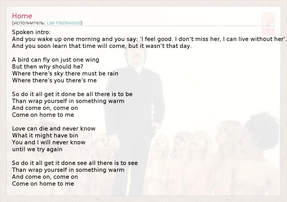 Это интересно:Ли Хезлвуд (англ. Lee Hazlewood, 9.07.1929 — 4.08.2007) — американский музыкант, автор песен, певец, продюсер. Ли Хезлвуд можно назвать одним из «серых кардиналов» современной музыки. Он, частично в соавторстве с Нэнси Синатрой (дочерью Фрэнка Синатры), написал такие хиты, как «This Boots Are Made For Walking», «Something Stupid», «Summer Wine», «Some Velvet Morning», на которые существует большое множество кавер-версий(Ник Кейв, Einstürzende... продолжение