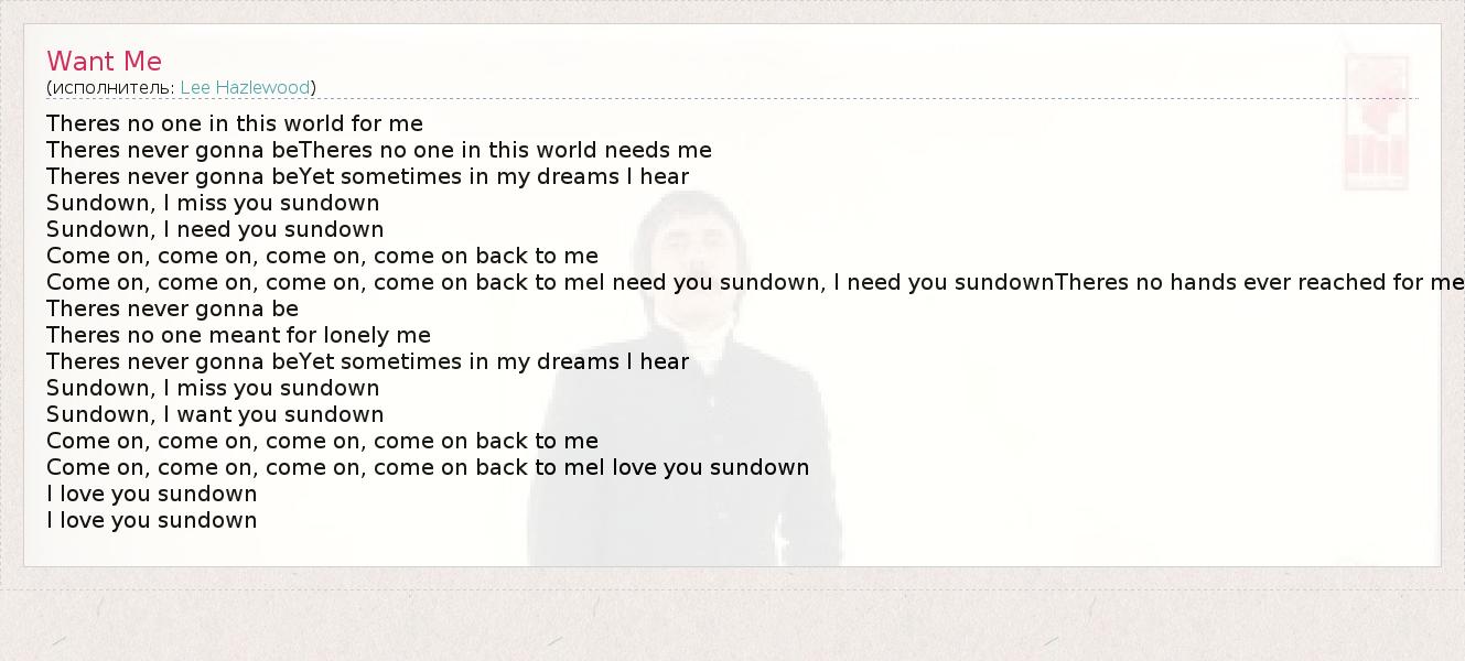 Это интересно:Ли Хезлвуд (англ. Lee Hazlewood, 9.07.1929 — 4.08.2007) — американский музыкант, автор песен, певец, продюсер. Ли Хезлвуд можно назвать одним из «серых кардиналов» современной музыки. Он, частично в соавторстве с Нэнси Синатрой (дочерью Фрэнка Синатры), написал такие хиты, как «This Boots Are Made For Walking», «Something Stupid», «Summer Wine», «Some Velvet Morning», на которые существует большое множество кавер-версий(Ник Кейв, Einstürzende... продолжение