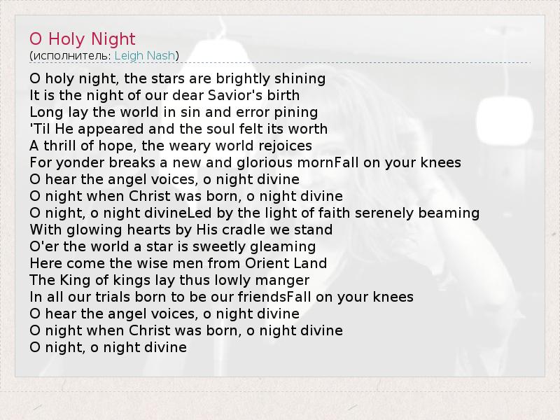 O holy night, the stars are brightly shining It is the night of our dear Savior's birth Long lay the world in sin and error pining 'Til He appeared and the soul felt its worth A thrill of hope, the weary world rejoices For yonder breaks a new and glorious mornFall on your knees O hear the angel voices, o night divine O night when Christ was born, o night divine O night, o night divineLed by the light of faith serenely beaming With glowing hearts by His cradle we stand O'er the world a star is sweetly gleaming Here come the wise men from Orient Land The King of kings lay thus lowly manger In all our trials born to be our friendsFall on your knees O hear the angel voices, o night divine O night when Christ was born, o night divine O night, o night divine