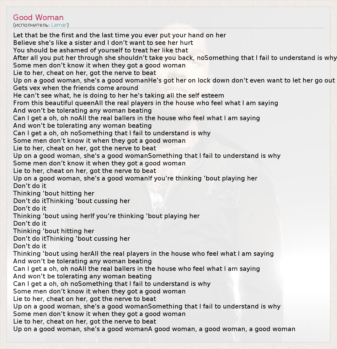 Let that be the first and the last time you ever put your hand on her Believe she's like a sister and I don't want to see her hurt You should be ashamed of yourself to treat her like that After all you put her through she shouldn't take you back, noSomething that I fail to understand is why Some men don't know it when they got a good woman Lie to her, cheat on her, got the nerve to beat Up on a good woman, she's a good womanHe's got her on lock down don't even want to let her go out Gets vex when the friends come around He can't see what, he is doing to her he's taking all the self esteem From this beautiful queenAll the real players in the house who feel what I am saying And won't be tolerating any woman beating Can I get a oh, oh noAll the real ballers in the house who feel what I am saying And won't be tolerating any woman beating Can I get a oh, oh noSomething that I fail to understand is why Some men don't know it when they got a good woman Lie to her, cheat on her, got the nerve to beat Up on a good woman, she's a good womanSomething that I fail to understand is why Some men don't know it when they got a good woman Lie to her, cheat on her, got the nerve to beat Up on a good woman, she's a good womanIf you're thinking 'bout playing her Don't do it Thinking 'bout hitting her Don't do itThinking 'bout cussing her Don't do it Thinking 'bout using herIf you're thinking 'bout playing her Don't do it Thinking 'bout hitting her Don't do itThinking 'bout cussing her Don't do it Thinking 'bout using herAll the real players in the house who feel what I am saying And won't be tolerating any woman beating Can I get a oh, oh noAll the real ballers in the house who feel what I am saying And won't be tolerating any woman beating Can I get a oh, oh noSomething that I fail to understand is why Some men don't know it when they got a good woman Lie to her, cheat on her, got the nerve to beat Up on a good woman, she's a good womanSomething that I fail to understand is why Some men don't know it when they got a good woman Lie to her, cheat on her, got the nerve to beat Up on a good woman, she's a good womanA good woman, a good woman, a good woman