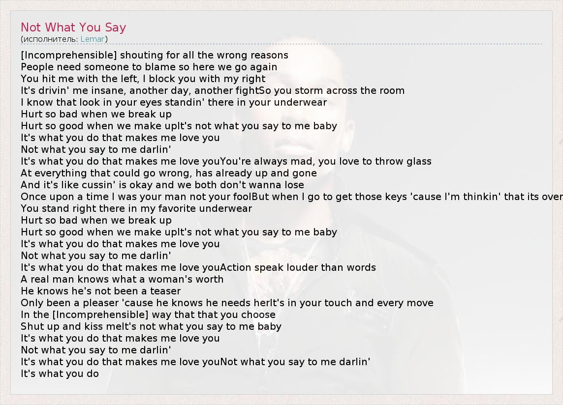 [Incomprehensible] shouting for all the wrong reasons People need someone to blame so here we go again You hit me with the left, I block you with my right It's drivin' me insane, another day, another fightSo you storm across the room I know that look in your eyes standin' there in your underwear Hurt so bad when we break up Hurt so good when we make upIt's not what you say to me baby It's what you do that makes me love you Not what you say to me darlin' It's what you do that makes me love youYou're always mad, you love to throw glass At everything that could go wrong, has already up and gone And it's like cussin' is okay and we both don't wanna lose Once upon a time I was your man not your foolBut when I go to get those keys 'cause I'm thinkin' that its over You stand right there in my favorite underwear Hurt so bad when we break up Hurt so good when we make upIt's not what you say to me baby It's what you do that makes me love you Not what you say to me darlin' It's what you do that makes me love youAction speak louder than words A real man knows what a woman's worth He knows he's not been a teaser Only been a pleaser 'cause he knows he needs herIt's in your touch and every move In the [Incomprehensible] way that that you choose Shut up and kiss meIt's not what you say to me baby It's what you do that makes me love you Not what you say to me darlin' It's what you do that makes me love youNot what you say to me darlin' It's what you do