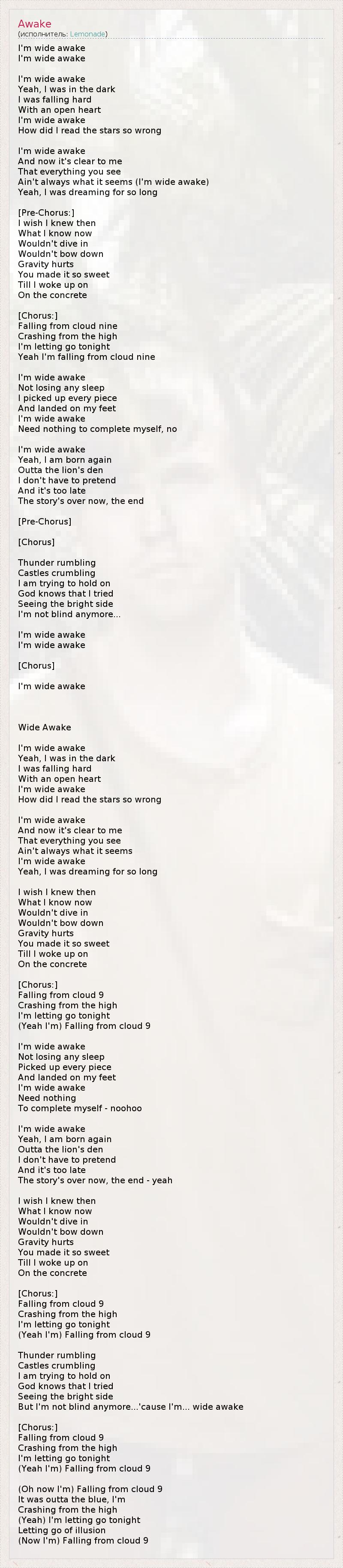 I'm wide awake I'm wide awake I'm wide awake Yeah, I was in the dark I was falling hard With an open heart I'm wide awake How did I read the stars so wrong I'm wide awake And now it's clear to me That everything you see Ain't always what it seems (I'm wide awake) Yeah, I was dreaming for so long [Pre-Chorus:] I wish I knew then What I know now Wouldn't dive in Wouldn't bow down Gravity hurts You made it so sweet Till I woke up on On the concrete [Chorus:] Falling from cloud nine Crashing from the high I'm letting go tonight Yeah I'm falling from cloud nine I'm wide awake Not losing any sleep I picked up every piece And landed on my feet I'm wide awake Need nothing to complete myself, no I'm wide awake Yeah, I am born again Outta the lion's den I don't have to pretend And it's too late The story's over now, the end [Pre-Chorus] [Chorus] Thunder rumbling Castles crumbling I am trying to hold on God knows that I tried Seeing the bright side I'm not blind anymore... I'm wide awake I'm wide awake [Chorus] I'm wide awake Wide Awake I'm wide awake Yeah, I was in the dark I was falling hard With an open heart I'm wide awake How did I read the stars so wrong I'm wide awake And now it's clear to me That everything you see Ain't always what it seems I'm wide awake Yeah, I was dreaming for so long I wish I knew then What I know now Wouldn't dive in Wouldn't bow down Gravity hurts You made it so sweet Till I woke up on On the concrete [Chorus:] Falling from cloud 9 Crashing from the high I'm letting go tonight (Yeah I'm) Falling from cloud 9 I'm wide awake Not losing any sleep Picked up every piece And landed on my feet I'm wide awake Need nothing To complete myself - noohoo I'm wide awake Yeah, I am born again Outta the lion's den I don't have to pretend And it's too late The story's over now, the end - yeah I wish I knew then What I know now Wouldn't dive in Wouldn't bow down Gravity hurts You made it so sweet Till I woke up on On the concrete [Chorus:] Falling from cloud 9 Crashing from the high I'm letting go tonight (Yeah I'm) Falling from cloud 9 Thunder rumbling Castles crumbling I am trying to hold on God knows that I tried Seeing the bright side But I'm not blind anymore...'cause I'm... wide awake [Chorus:] Falling from cloud 9 Crashing from the high I'm letting go tonight (Yeah I'm) Falling from cloud 9 (Oh now I'm) Falling from cloud 9 It was outta the blue, I'm Crashing from the high (Yeah) I'm letting go tonight Letting go of illusion (Now I'm) Falling from cloud 9