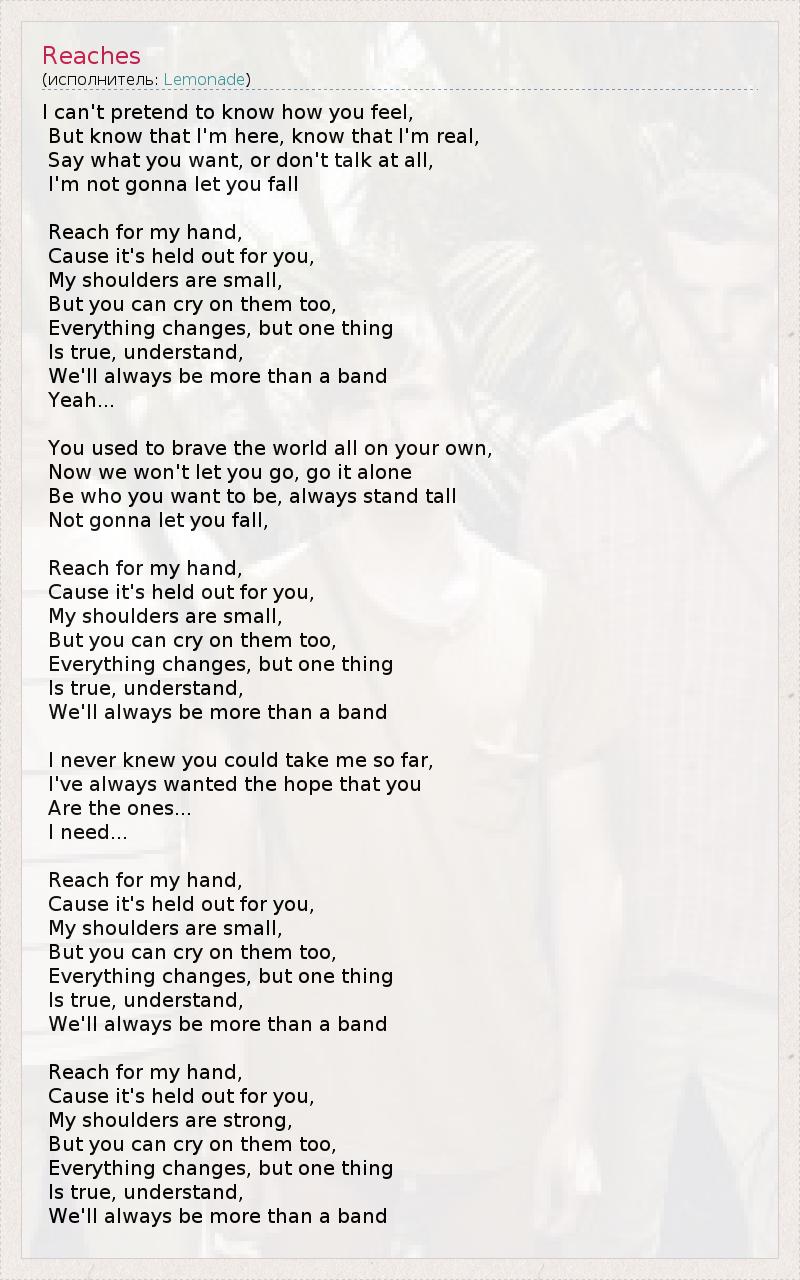 I can't pretend to know how you feel, But know that I'm here, know that I'm real, Say what you want, or don't talk at all, I'm not gonna let you fall Reach for my hand, Cause it's held out for you, My shoulders are small, But you can cry on them too, Everything changes, but one thing Is true, understand, We'll always be more than a band Yeah... You used to brave the world all on your own, Now we won't let you go, go it alone Be who you want to be, always stand tall Not gonna let you fall, Reach for my hand, Cause it's held out for you, My shoulders are small, But you can cry on them too, Everything changes, but one thing Is true, understand, We'll always be more than a band I never knew you could take me so far, I've always wanted the hope that you Are the ones... I need... Reach for my hand, Cause it's held out for you, My shoulders are small, But you can cry on them too, Everything changes, but one thing Is true, understand, We'll always be more than a band Reach for my hand, Cause it's held out for you, My shoulders are strong, But you can cry on them too, Everything changes, but one thing Is true, understand, We'll always be more than a band