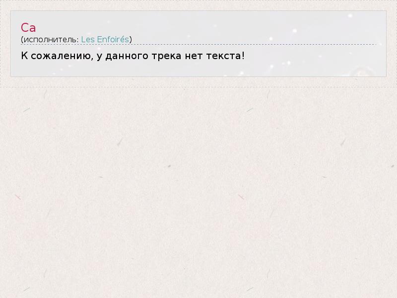 Это интересно:"Les Enfoirés" (Лез Анфуаре) ("Глупцы") - одно из замечательнейших событий в жизни французской музыки. Ежегодно группа артистов собирается вместе, чтобы дать серию благотворительных концертов. Собранные средства направляются в фонд "Ресторанчиков сердца" ("Restaurants de coeur"), в которых нищие и обездоленные всегда могут найти порцию вкусного и бесплатного обеда.Идея создания... продолжение