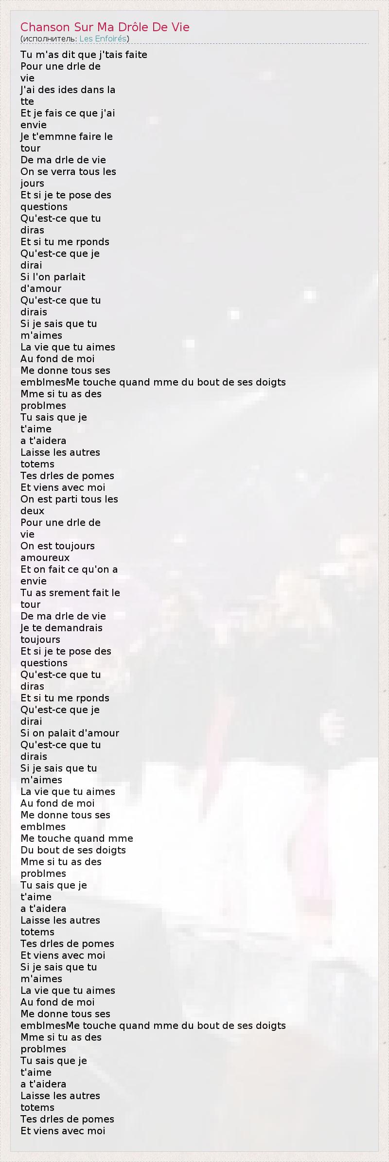 ГлавнаяИсполнителиLes EnfoirésChanson Sur Ma Drôle De Vie