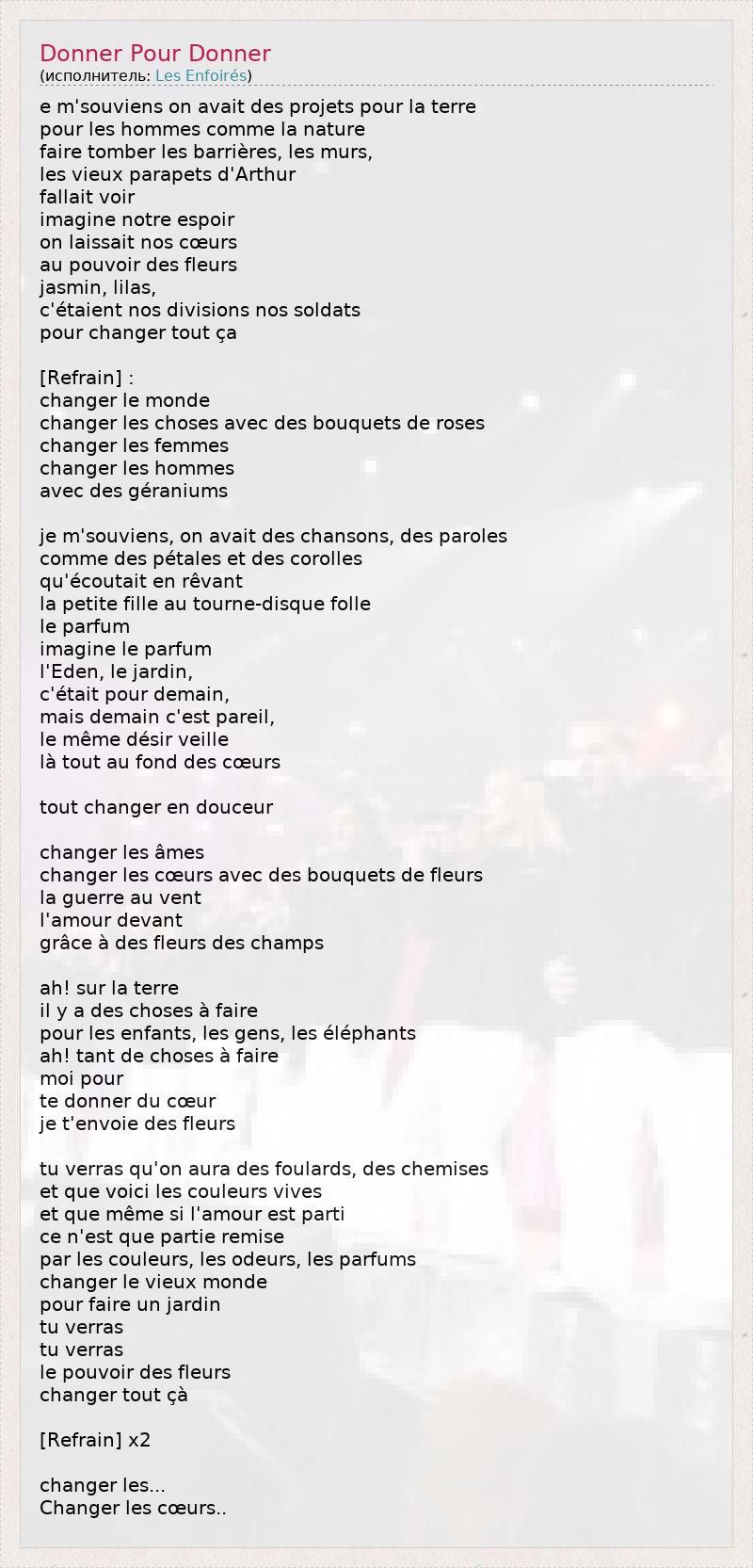 Это интересно:"Les Enfoirés" (Лез Анфуаре) ("Глупцы") - одно из замечательнейших событий в жизни французской музыки. Ежегодно группа артистов собирается вместе, чтобы дать серию благотворительных концертов. Собранные средства направляются в фонд "Ресторанчиков сердца" ("Restaurants de coeur"), в которых нищие и обездоленные всегда могут найти порцию вкусного и бесплатного обеда.Идея создания... продолжение
