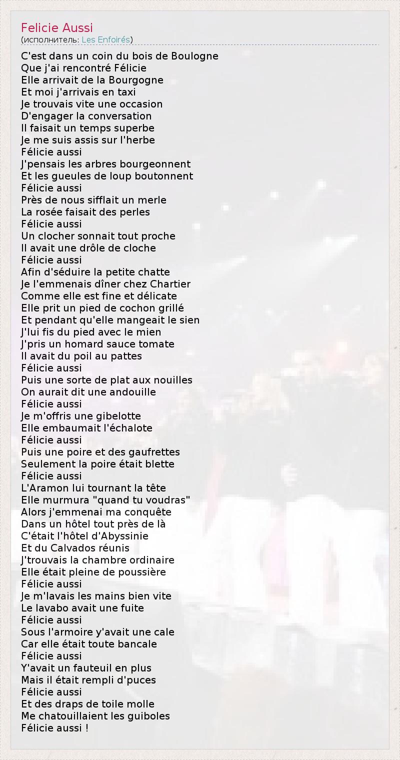 C'est данс Un Coin Дюбуа де Булонь Que j'ai RENCONTRE FELICIE Elle arrivait -де-ла Bourgogne Et Moi j'arrivais ан такси Je trouvais физации Une повод D' Engager ла разговор Il faisait ип Temps Superbe Je меня суис асси сюр l' Herbe FELICIE Aussi J'pensais ле Arbres bourgeonnent Et Les gueules де Лу boutonnent FELICIE Aussi Пре -де- нус sifflait ООН мраморный La rosée faisait де Perles FELICIE Aussi Un Clocher sonnait зазывают Proche Il avait Une Drole де Cloche FELICIE Aussi Afin d' séduire La Petite Chatte Je l' emmenais dîner Chez Шартье Comme Elle Est прекрасно др Нежный Elle Prit ООН пестрый де Кошон решетку Et кулон qu'elle mangeait ле Sien J'lui мкс дю пестрая АВЭК ле выражение лица J'pris ООН Homard соус Tomate Il avait дю Poil а.е. Pattes FELICIE Aussi Puis Une Sorte де Плат AUX Nouilles На aurait дит ипе Andouille FELICIE Aussi Je m'offris ипе gibelotte Elle embaumait l' échalote FELICIE Aussi Puis Une Пуаре др де gaufrettes Seulement ла Пуаре était blette FELICIE Aussi L' Aramon луй tournant ла тет Elle murmura & Quot ; Quand ту voudras & Quot ; Alors j'emmenai ма conquête Dans ООН Hôtel зазывают Пре -де-ла C'était l' Hôtel d' Abyssinie Et -дю- Кальвадос réunis J'trouvais La Chambre Ordinaire Elle était Pleine де Poussiere FELICIE Aussi Je m'lavais ле сети Ыеп физации Le Lavabo avait Une fuite FELICIE Aussi Sous l' шкаф y'avait Une Сетевой Автомобиль Elle était Toute bancale FELICIE Aussi Y'avait ООН Fauteuil ан плюс Mais иль était rempli d' Puces FELICIE Aussi Et Des Draps де вуаль Молл Меня chatouillaient ле guiboles FELICIE Aussi !