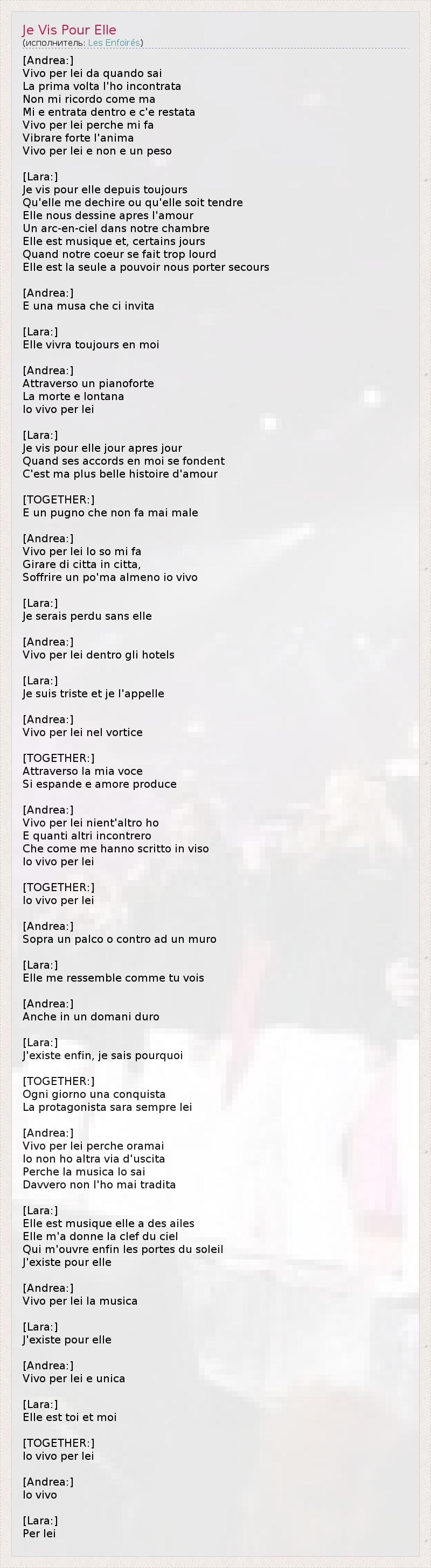 [Andrea:] Vivo per lei da quando sai La prima volta l'ho incontrata Non mi ricordo come ma Mi e entrata dentro e c'e restata Vivo per lei perche mi fa Vibrare forte l'anima Vivo per lei e non e un peso [Lara:] Je vis pour elle depuis toujours Qu'elle me dechire ou qu'elle soit tendre Elle nous dessine apres l'amour Un arc-en-ciel dans notre chambre Elle est musique et, certains jours Quand notre coeur se fait trop lourd Elle est la seule a pouvoir nous porter secours [Andrea:] E una musa che ci invita [Lara:] Elle vivra toujours en moi [Andrea:] Attraverso un pianoforte La morte e lontana Io vivo per lei [Lara:] Je vis pour elle jour apres jour Quand ses accords en moi se fondent C'est ma plus belle histoire d'amour [TOGETHER:] E un pugno che non fa mai male [Andrea:] Vivo per lei lo so mi fa Girare di citta in citta, Soffrire un po'ma almeno io vivo [Lara:] Je serais perdu sans elle [Andrea:] Vivo per lei dentro gli hotels [Lara:] Je suis triste et je l'appelle [Andrea:] Vivo per lei nel vortice [TOGETHER:] Attraverso la mia voce Si espande e amore produce [Andrea:] Vivo per lei nient'altro ho E quanti altri incontrero Che come me hanno scritto in viso Io vivo per lei [TOGETHER:] Io vivo per lei [Andrea:] Sopra un palco o contro ad un muro [Lara:] Elle me ressemble comme tu vois [Andrea:] Anche in un domani duro [Lara:] J'existe enfin, je sais pourquoi [TOGETHER:] Ogni giorno una conquista La protagonista sara sempre lei [Andrea:] Vivo per lei perche oramai Io non ho altra via d'uscita Perche la musica lo sai Davvero non l'ho mai tradita [Lara:] Elle est musique elle a des ailes Elle m'a donne la clef du ciel Qui m'ouvre enfin les portes du soleil J'existe pour elle [Andrea:] Vivo per lei la musica [Lara:] J'existe pour elle [Andrea:] Vivo per lei e unica [Lara:] Elle est toi et moi [TOGETHER:] Io vivo per lei [Andrea:] Io vivo [Lara:] Per lei