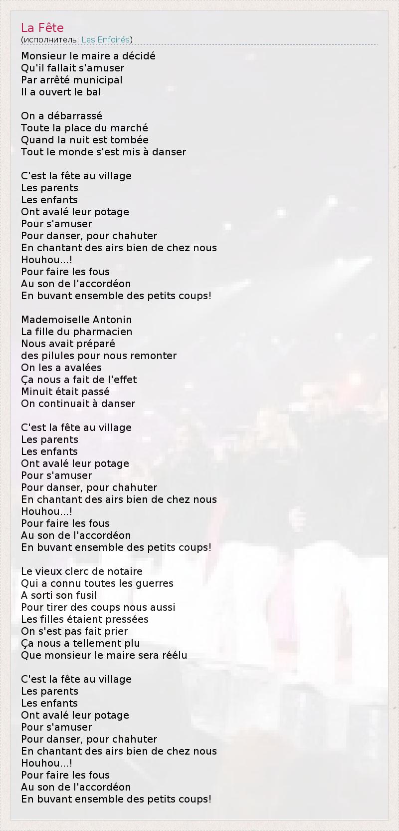 Это интересно:"Les Enfoirés" (Лез Анфуаре) ("Глупцы") - одно из замечательнейших событий в жизни французской музыки. Ежегодно группа артистов собирается вместе, чтобы дать серию благотворительных концертов. Собранные средства направляются в фонд "Ресторанчиков сердца" ("Restaurants de coeur"), в которых нищие и обездоленные всегда могут найти порцию вкусного и бесплатного обеда.Идея создания... продолжение