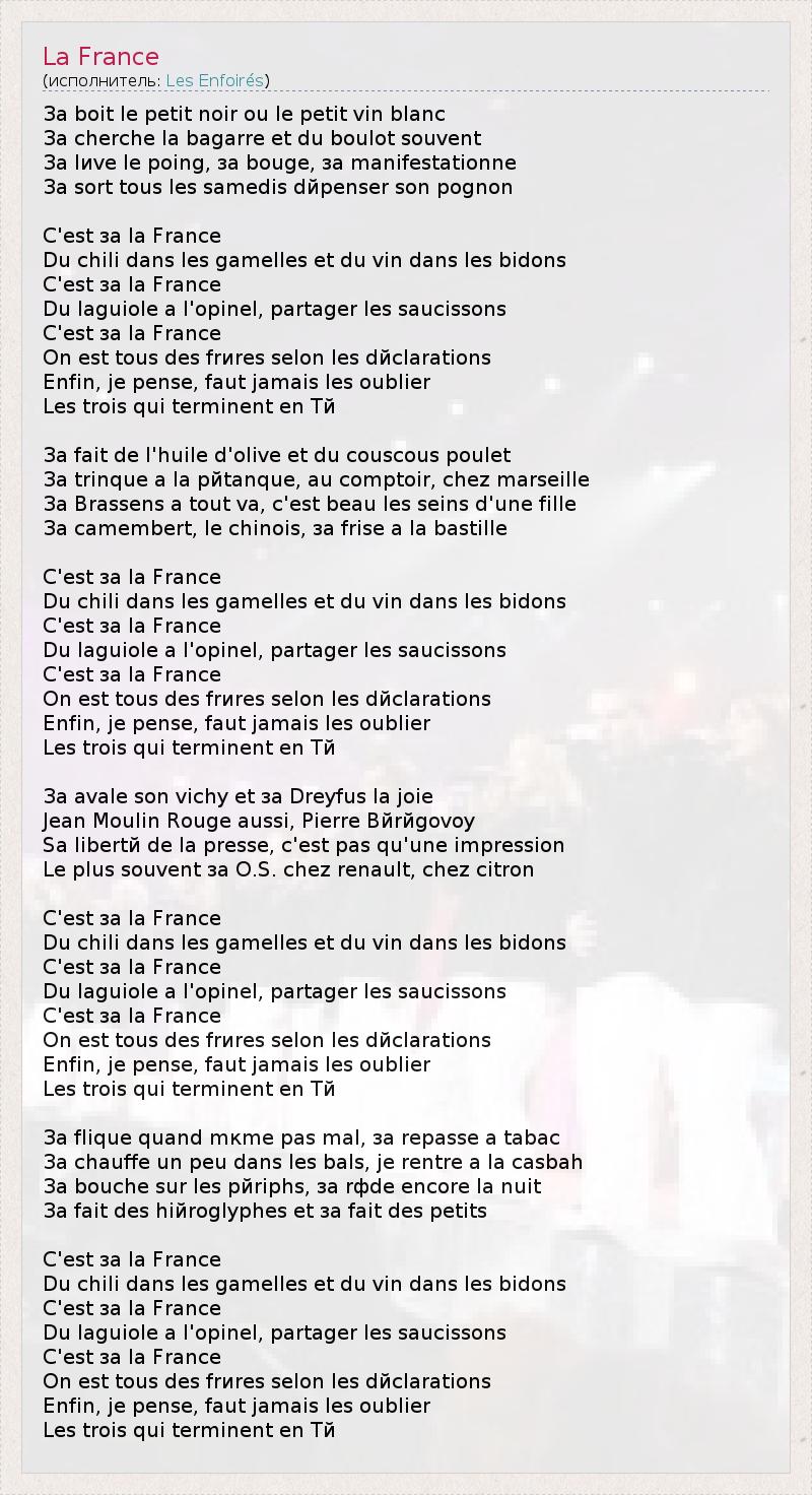 Это интересно:"Les Enfoirés" (Лез Анфуаре) ("Глупцы") - одно из замечательнейших событий в жизни французской музыки. Ежегодно группа артистов собирается вместе, чтобы дать серию благотворительных концертов. Собранные средства направляются в фонд "Ресторанчиков сердца" ("Restaurants de coeur"), в которых нищие и обездоленные всегда могут найти порцию вкусного и бесплатного обеда.Идея создания... продолжение