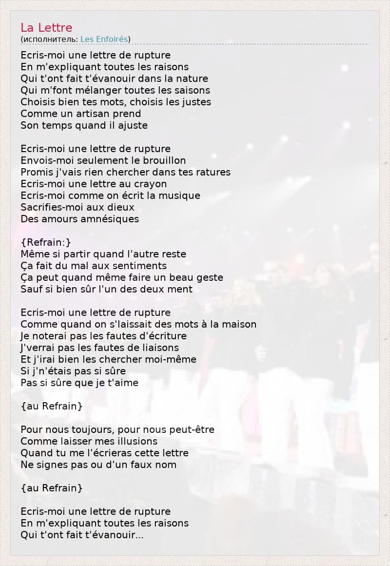 Напиши мне прощальное письмо, Объясняя все причины, Которые заставили тебя раствориться, Из-за которых я путаю времена года, Подбирай слова, подбирай доводы, Как художник, Который делает наброски Напиши мне прощальное письмо, Отправь мне только черновик, Обещаю, не буду читать то, что ты зачеркнёшь, Напиши мне письмо карандашом, Напиши мне как пишут музыку, Пожертвуй меня богам Забытой любви [Припев:] Даже когда уходишь, оставляя другого, Остаются осадок, Всё равно что сделать красивый жест, Зная что один из двух лжёт Напиши мне прощальное письмо, Как будто оставляешь текст дома, Я не замечу ошибок в стиле, Не увижу ошибок в соединении слов, И я бы не искала там ничего о себе, Если бы не была так уверена, Так уверена что люблю тебя [Припев] Для нас навсегда, для нас, может быть Будто ставляя мои иллюзии, Когда напишешь мне это письмо, Не подписывай или поставь чужое имя [Припев] Напиши мне прощальное письмо, Объясняя все причины, Которые заставили тебя раствориться...
