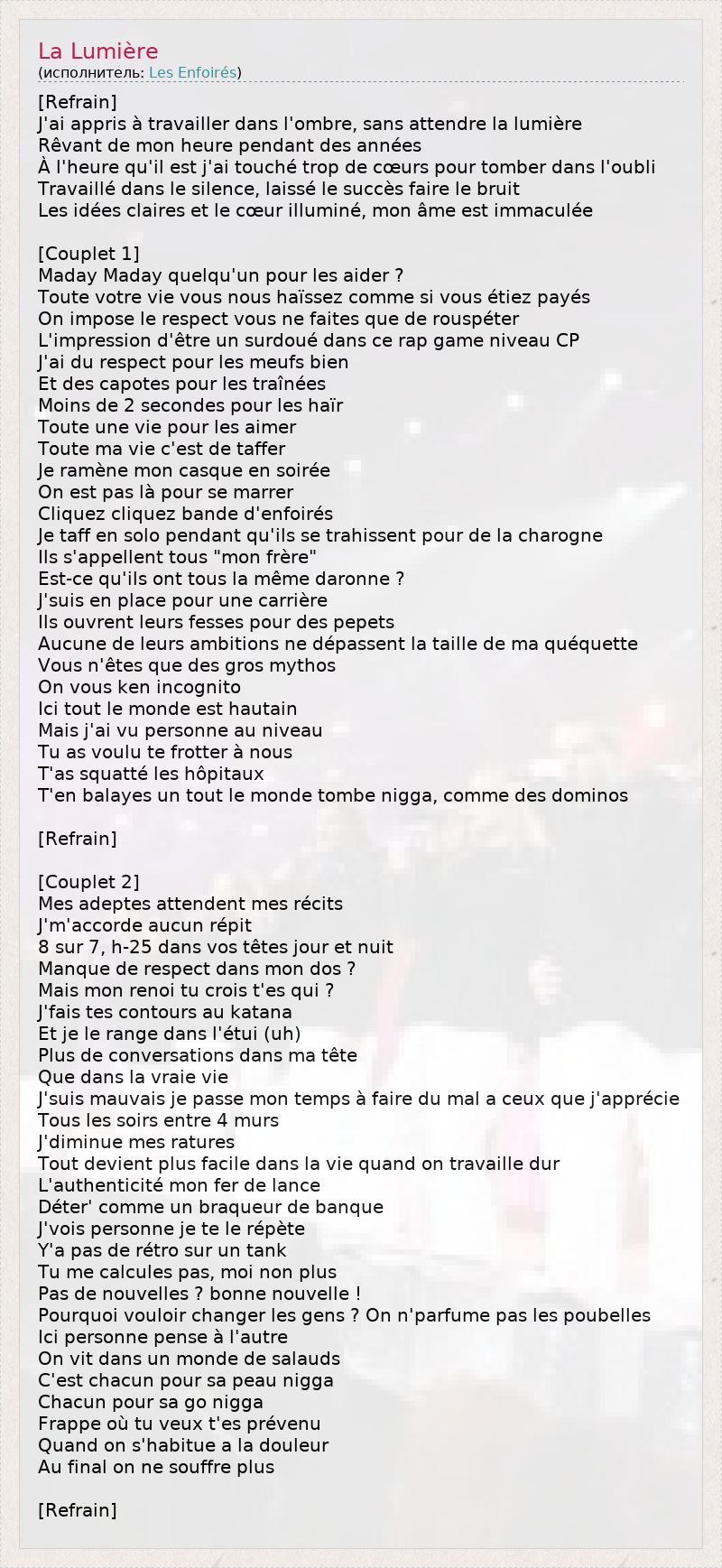 [Refrain] J'ai appris à travailler dans l'ombre, sans attendre la lumière Rêvant de mon heure pendant des années À l'heure qu'il est j'ai touché trop de cœurs pour tomber dans l'oubli Travaillé dans le silence, laissé le succès faire le bruit Les idées claires et le cœur illuminé, mon âme est immaculée [Couplet 1] Maday Maday quelqu'un pour les aider ? Toute votre vie vous nous haïssez comme si vous étiez payés On impose le respect vous ne faites que de rouspéter L'impression d'être un surdoué dans ce rap game niveau CP J'ai du respect pour les meufs bien Et des capotes pour les traînées Moins de 2 secondes pour les haïr Toute une vie pour les aimer Toute ma vie c'est de taffer Je ramène mon casque en soirée On est pas là pour se marrer Cliquez cliquez bande d'enfoirés Je taff en solo pendant qu'ils se trahissent pour de la charogne Ils s'appellent tous "mon frère" Est-ce qu'ils ont tous la même daronne ? J'suis en place pour une carrière Ils ouvrent leurs fesses pour des pepets Aucune de leurs ambitions ne dépassent la taille de ma quéquette Vous n'êtes que des gros mythos On vous ken incognito Ici tout le monde est hautain Mais j'ai vu personne au niveau Tu as voulu te frotter à nous T'as squatté les hôpitaux T'en balayes un tout le monde tombe nigga, comme des dominos [Refrain] [Couplet 2] Mes adeptes attendent mes récits J'm'accorde aucun répit 8 sur 7, h-25 dans vos têtes jour et nuit Manque de respect dans mon dos ? Mais mon renoi tu crois t'es qui ? J'fais tes contours au katana Et je le range dans l'étui (uh) Plus de conversations dans ma tête Que dans la vraie vie J'suis mauvais je passe mon temps à faire du mal a ceux que j'apprécie Tous les soirs entre 4 murs J'diminue mes ratures Tout devient plus facile dans la vie quand on travaille dur L'authenticité mon fer de lance Déter' comme un braqueur de banque J'vois personne je te le répète Y'a pas de rétro sur un tank Tu me calcules pas, moi non plus Pas de nouvelles ? bonne nouvelle ! Pourquoi vouloir changer les gens ? On n'parfume pas les poubelles Ici personne pense à l'autre On vit dans un monde de salauds C'est chacun pour sa peau nigga Chacun pour sa go nigga Frappe où tu veux t'es prévenu Quand on s'habitue a la douleur Au final on ne souffre plus [Refrain]