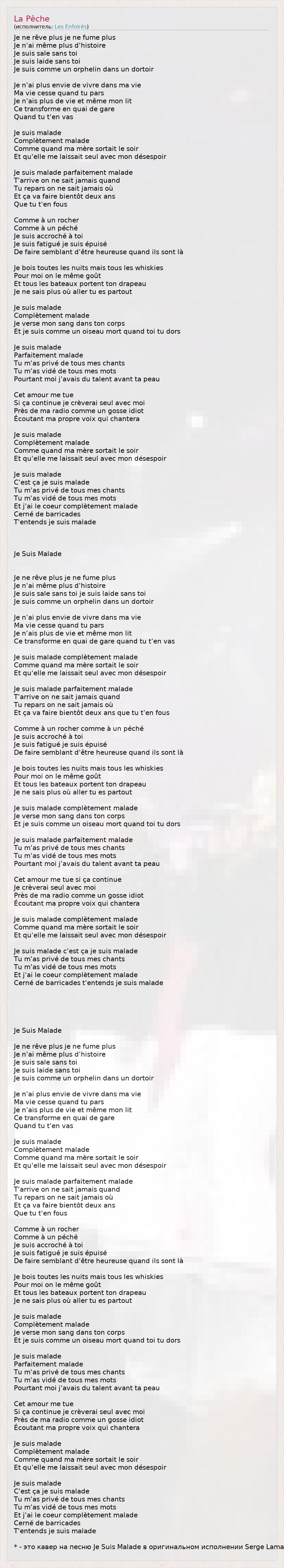 Je ne rêve plus je ne fume plus Je n'ai même plus d'histoire Je suis sale sans toi Je suis laide sans toi Je suis comme un orphelin dans un dortoir Je n'ai plus envie de vivre dans ma vie Ma vie cesse quand tu pars Je n'ais plus de vie et même mon lit Ce transforme en quai de gare Quand tu t'en vas Je suis malade Complètement malade Comme quand ma mère sortait le soir Et qu'elle me laissait seul avec mon désespoir Je suis malade parfaitement malade T'arrive on ne sait jamais quand Tu repars on ne sait jamais où Et ça va faire bientôt deux ans Que tu t'en fous Comme à un rocher Comme à un péché Je suis accroché à toi Je suis fatigué je suis épuisé De faire semblant d'être heureuse quand ils sont là Je bois toutes les nuits mais tous les whiskies Pour moi on le même goût Et tous les bateaux portent ton drapeau Je ne sais plus où aller tu es partout Je suis malade Complètement malade Je verse mon sang dans ton corps Et je suis comme un oiseau mort quand toi tu dors Je suis malade Parfaitement malade Tu m'as privé de tous mes chants Tu m'as vidé de tous mes mots Pourtant moi j'avais du talent avant ta peau Cet amour me tue Si ça continue je crèverai seul avec moi Près de ma radio comme un gosse idiot Écoutant ma propre voix qui chantera Je suis malade Complètement malade Comme quand ma mère sortait le soir Et qu'elle me laissait seul avec mon désespoir Je suis malade C'est ça je suis malade Tu m'as privé de tous mes chants Tu m'as vidé de tous mes mots Et j'ai le coeur complètement malade Cerné de barricades T'entends je suis malade Je Suis Malade Je ne rêve plus je ne fume plus Je n'ai même plus d'histoire Je suis sale sans toi je suis laide sans toi Je suis comme un orphelin dans un dortoir Je n'ai plus envie de vivre dans ma vie Ma vie cesse quand tu pars Je n'ais plus de vie et même mon lit Ce transforme en quai de gare quand tu t'en vas Je suis malade complètement malade Comme quand ma mère sortait le soir Et qu'elle me laissait seul avec mon désespoir Je suis malade parfaitement malade T'arrive on ne sait jamais quand Tu repars on ne sait jamais où Et ça va faire bientôt deux ans que tu t'en fous Comme à un rocher comme à un péché Je suis accroché à toi Je suis fatigué je suis épuisé De faire semblant d'être heureuse quand ils sont là Je bois toutes les nuits mais tous les whiskies Pour moi on le même goût Et tous les bateaux portent ton drapeau Je ne sais plus où aller tu es partout Je suis malade complètement malade Je verse mon sang dans ton corps Et je suis comme un oiseau mort quand toi tu dors Je suis malade parfaitement malade Tu m'as privé de tous mes chants Tu m'as vidé de tous mes mots Pourtant moi j'avais du talent avant ta peau Cet amour me tue si ça continue Je crèverai seul avec moi Près de ma radio comme un gosse idiot Écoutant ma propre voix qui chantera Je suis malade complètement malade Comme quand ma mère sortait le soir Et qu'elle me laissait seul avec mon désespoir Je suis malade c'est ça je suis malade Tu m'as privé de tous mes chants Tu m'as vidé de tous mes mots Et j'ai le coeur complètement malade Cerné de barricades t'entends je suis malade Je Suis Malade Je ne rêve plus je ne fume plus Je n'ai même plus d'histoire Je suis sale sans toi Je suis laide sans toi Je suis comme un orphelin dans un dortoir Je n'ai plus envie de vivre dans ma vie Ma vie cesse quand tu pars Je n'ais plus de vie et même mon lit Ce transforme en quai de gare Quand tu t'en vas Je suis malade Complètement malade Comme quand ma mère sortait le soir Et qu'elle me laissait seul avec mon désespoir Je suis malade parfaitement malade T'arrive on ne sait jamais quand Tu repars on ne sait jamais où Et ça va faire bientôt deux ans Que tu t'en fous Comme à un rocher Comme à un péché Je suis accroché à toi Je suis fatigué je suis épuisé De faire semblant d'être heureuse quand ils sont là Je bois toutes les nuits mais tous les whiskies Pour moi on le même goût Et tous les bateaux portent ton drapeau Je ne sais plus où aller tu es partout Je suis malade Complètement malade Je verse mon sang dans ton corps Et je suis comme un oiseau mort quand toi tu dors Je suis malade Parfaitement malade Tu m'as privé de tous mes chants Tu m'as vidé de tous mes mots Pourtant moi j'avais du talent avant ta peau Cet amour me tue Si ça continue je crèverai seul avec moi Près de ma radio comme un gosse idiot Écoutant ma propre voix qui chantera Je suis malade Complètement malade Comme quand ma mère sortait le soir Et qu'elle me laissait seul avec mon désespoir Je suis malade C'est ça je suis malade Tu m'as privé de tous mes chants Tu m'as vidé de tous mes mots Et j'ai le coeur complètement malade Cerné de barricades T'entends je suis malade * - это кавер на песню Je Suis Malade в оригинальном исполнении Serge Lama