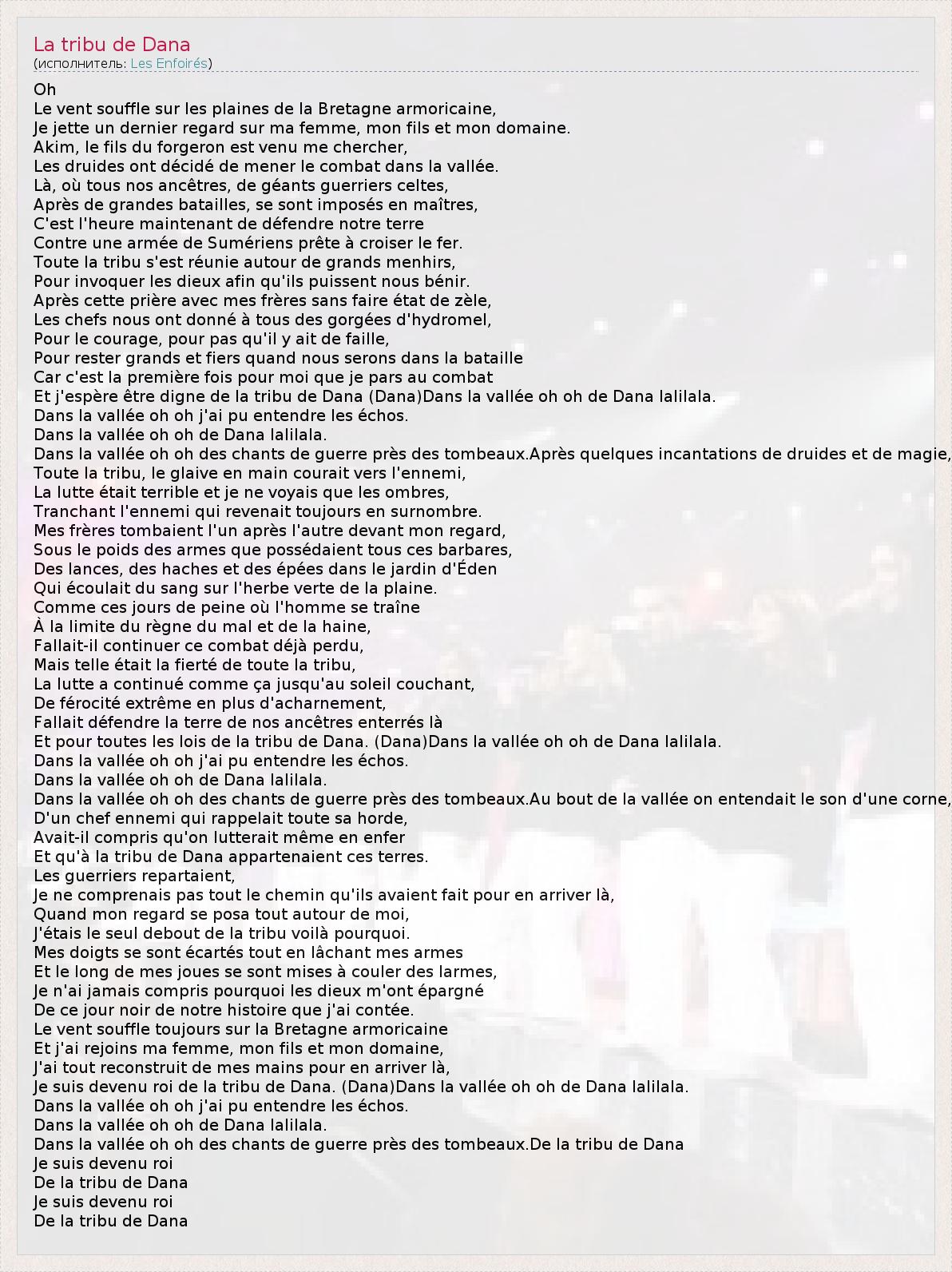 Et pour toutes les lois de la tribu de Dana. (Dana)Dans la vallée oh oh de Dana lalilala.