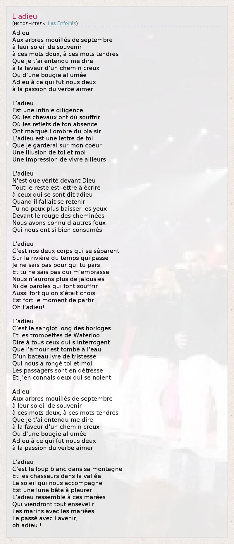 Adieu Aux arbres mouillés de septembre à leur soleil de souvenir à ces mots doux, à ces mots tendres Que je t'ai entendu me dire à la faveur d'un chemin creux Ou d'une bougie allumée Adieu à ce qui fut nous deux à la passion du verbe aimer L'adieu Est une infinie diligence Où les chevaux ont dû souffrir Où les reflets de ton absence Ont marqué l'ombre du plaisir L'adieu est une lettre de toi Que je garderai sur mon coeur Une illusion de toi et moi Une impression de vivre ailleurs L'adieu N'est que vérité devant Dieu Tout le reste est lettre à écrire à ceux qui se sont dit adieu Quand il fallait se retenir Tu ne peux plus baisser les yeux Devant le rouge des cheminées Nous avons connu d'autres feux Qui nous ont si bien consumés L'adieu C'est nos deux corps qui se séparent Sur la rivière du temps qui passe Je ne sais pas pour qui tu pars Et tu ne sais pas qui m'embrasse Nous n'aurons plus de jalousies Ni de paroles qui font souffrir Aussi fort qu'on s'était choisi Est fort le moment de partir Oh l'adieu! L'adieu C'est le sanglot long des horloges Et les trompettes de Waterloo Dire à tous ceux qui s'interrogent Que l'amour est tombé à l'eau D'un bateau ivre de tristesse Qui nous a rongé toi et moi Les passagers sont en détresse Et j'en connais deux qui se noient Adieu Aux arbres mouillés de septembre à leur soleil de souvenir à ces mots doux, à ces mots tendres Que je t'ai entendu me dire à la faveur d'un chemin creux Ou d'une bougie allumée Adieu à ce qui fut nous deux à la passion du verbe aimer L'adieu C'est le loup blanc dans sa montagne Et les chasseurs dans la vallée Le soleil qui nous accompagne Est une lune bête à pleurer L'adieu ressemble à ces marées Qui viendront tout ensevelir Les marins avec les mariées Le passé avec l'avenir, oh adieu !