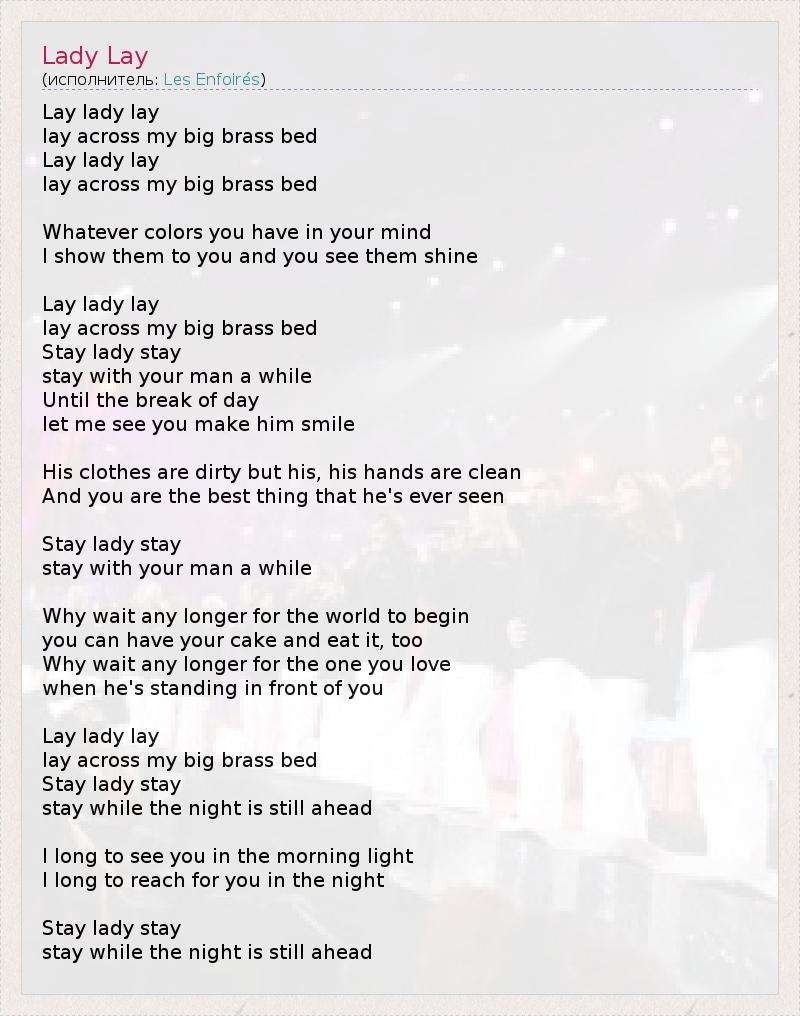 Lay lady lay lay across my big brass bed Lay lady lay lay across my big brass bed Whatever colors you have in your mind I show them to you and you see them shine Lay lady lay lay across my big brass bed Stay lady stay stay with your man a while Until the break of day let me see you make him smile His clothes are dirty but his, his hands are clean And you are the best thing that he's ever seen Stay lady stay stay with your man a while Why wait any longer for the world to begin you can have your cake and eat it, too Why wait any longer for the one you love when he's standing in front of you Lay lady lay lay across my big brass bed Stay lady stay stay while the night is still ahead I long to see you in the morning light I long to reach for you in the night Stay lady stay stay while the night is still ahead