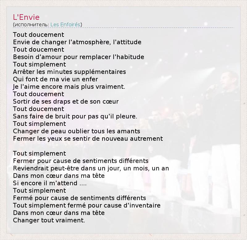 Это интересно:"Les Enfoirés" (Лез Анфуаре) ("Глупцы") - одно из замечательнейших событий в жизни французской музыки. Ежегодно группа артистов собирается вместе, чтобы дать серию благотворительных концертов. Собранные средства направляются в фонд "Ресторанчиков сердца" ("Restaurants de coeur"), в которых нищие и обездоленные всегда могут найти порцию вкусного и бесплатного обеда.Идея создания... продолжение