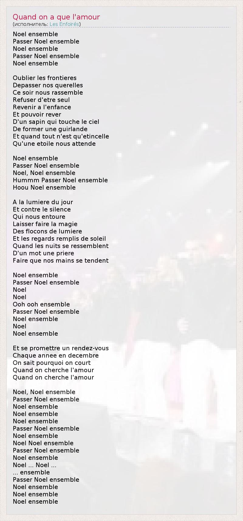 Noel ensemble Passer Noel ensemble Noel ensemble Passer Noel ensemble Noel ensemble Oublier les frontieres Depasser nos querelles Ce soir nous rassemble Refuser d'etre seul Revenir a l'enfance Et pouvoir rever D'un sapin qui touche le ciel De former une guirlande Et quand tout n'est qu'etincelle Qu'une etoile nous attende Noel ensemble Passer Noel ensemble Noel, Noel ensemble Hummm Passer Noel ensemble Hoou Noel ensemble A la lumiere du jour Et contre le silence Qui nous entoure Laisser faire la magie Des flocons de lumiere Et les regards remplis de soleil Quand les nuits se ressemblent D'un mot une priere Faire que nos mains se tendent Noel ensemble Passer Noel ensemble Noel Noel Ooh ooh ensemble Passer Noel ensemble Noel ensemble Noel Noel ensemble Et se promettre un rendez-vous Chaque annee en decembre On sait pourquoi on court Quand on cherche l'amour Quand on cherche l'amour Noel, Noel ensemble Passer Noel ensemble Noel ensemble Noel ensemble Noel ensemble Passer Noel ensemble Noel ensemble Noel Noel ensemble Passer Noel ensemble Noel ensemble Noel ... Noel ... ... ensemble Passer Noel ensemble Noel ensemble Noel ensemble Noel ensemble