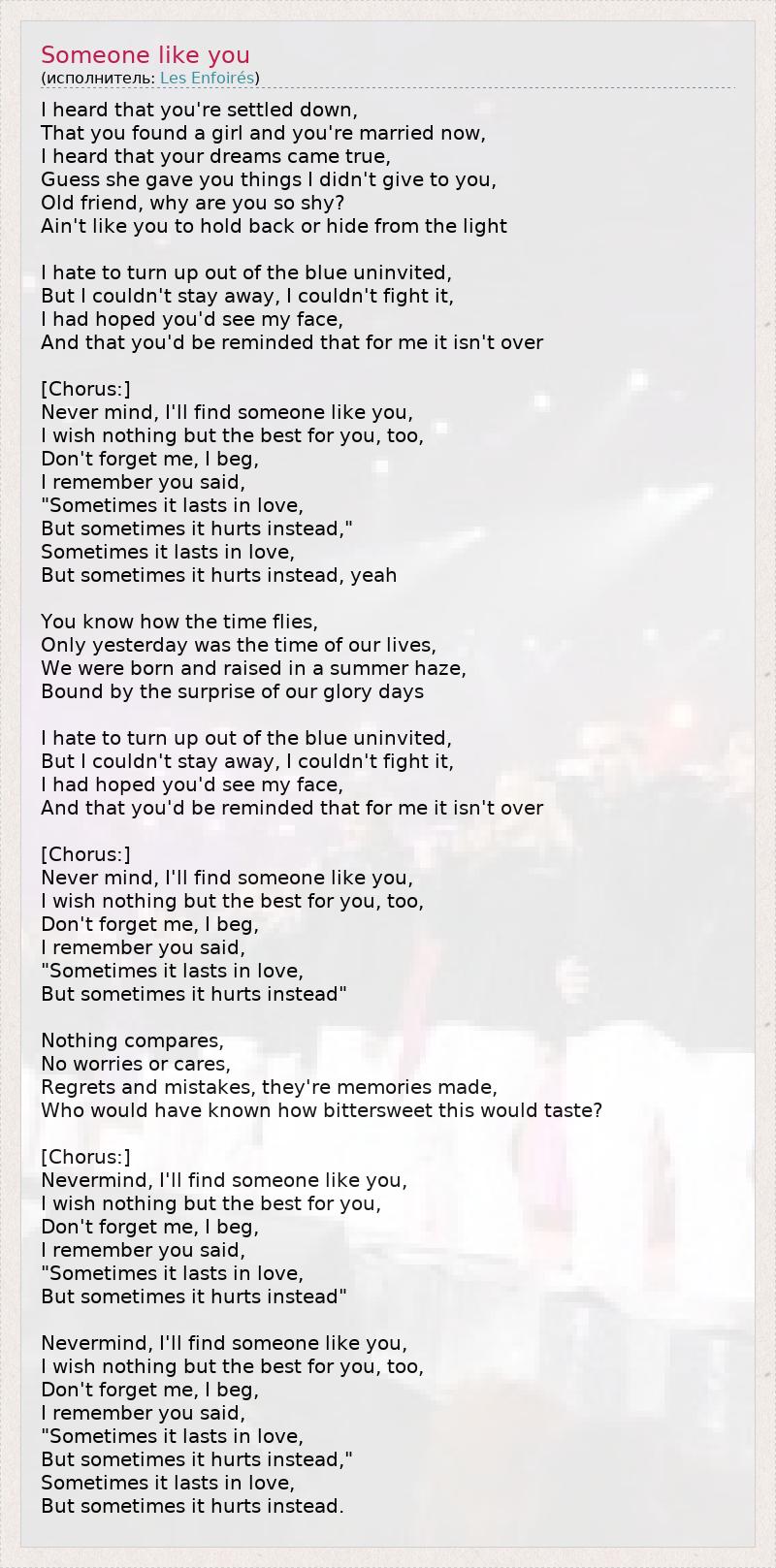 I heard that you're settled down, That you found a girl and you're married now, I heard that your dreams came true, Guess she gave you things I didn't give to you, Old friend, why are you so shy? Ain't like you to hold back or hide from the light I hate to turn up out of the blue uninvited, But I couldn't stay away, I couldn't fight it, I had hoped you'd see my face, And that you'd be reminded that for me it isn't over [Chorus:] Never mind, I'll find someone like you, I wish nothing but the best for you, too, Don't forget me, I beg, I remember you said, "Sometimes it lasts in love, But sometimes it hurts instead," Sometimes it lasts in love, But sometimes it hurts instead, yeah You know how the time flies, Only yesterday was the time of our lives, We were born and raised in a summer haze, Bound by the surprise of our glory days I hate to turn up out of the blue uninvited, But I couldn't stay away, I couldn't fight it, I had hoped you'd see my face, And that you'd be reminded that for me it isn't over [Chorus:] Never mind, I'll find someone like you, I wish nothing but the best for you, too, Don't forget me, I beg, I remember you said, "Sometimes it lasts in love, But sometimes it hurts instead" Nothing compares, No worries or cares, Regrets and mistakes, they're memories made, Who would have known how bittersweet this would taste? [Chorus:] Nevermind, I'll find someone like you, I wish nothing but the best for you, Don't forget me, I beg, I remember you said, "Sometimes it lasts in love, But sometimes it hurts instead" Nevermind, I'll find someone like you, I wish nothing but the best for you, too, Don't forget me, I beg, I remember you said, "Sometimes it lasts in love, But sometimes it hurts instead," Sometimes it lasts in love, But sometimes it hurts instead.