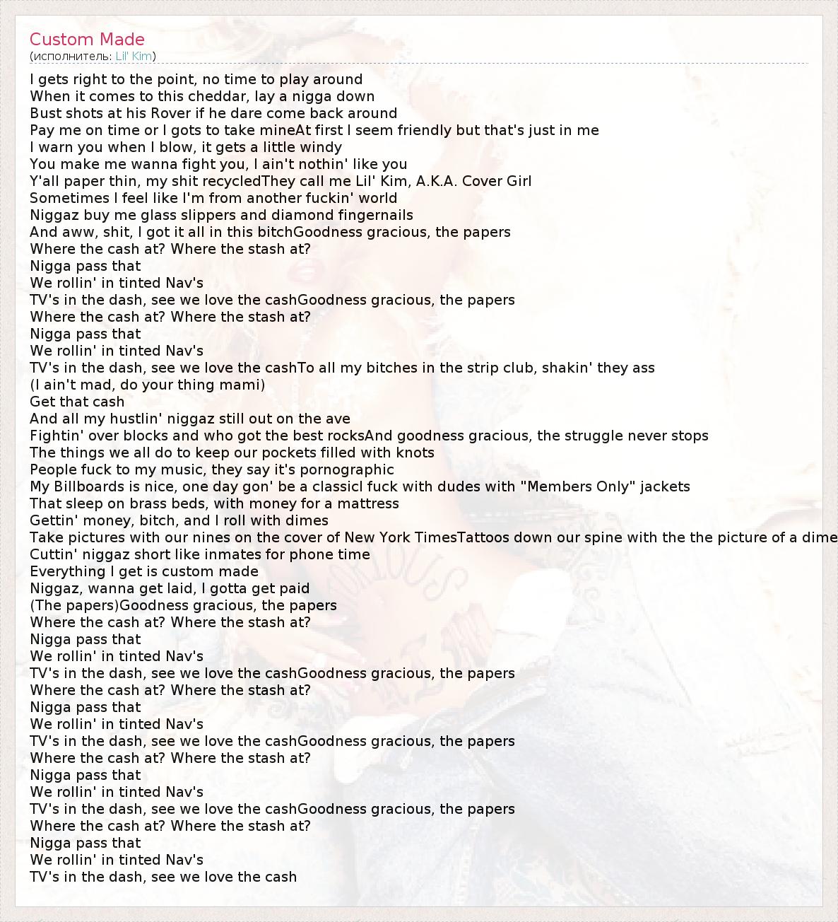 Это интересно:Имя: Kimberly Denise Jones.Псевдоним: Lil' Kim.Дата и место рождения: 11 июля 1975 года, Бруклин, Нью-Йорк.После развода родителей, когда Ким было 9 лет, она стала жить с отцом. Изначально Ким и ее старший брат Кристофер, жили с матерью, до тех пор, пока опека над детьми не была передана её отцу. Ким была непослушным ребёнком, но ей приходилось жить по строгим правила её отца, из-за чего, они постоянно... продолжение