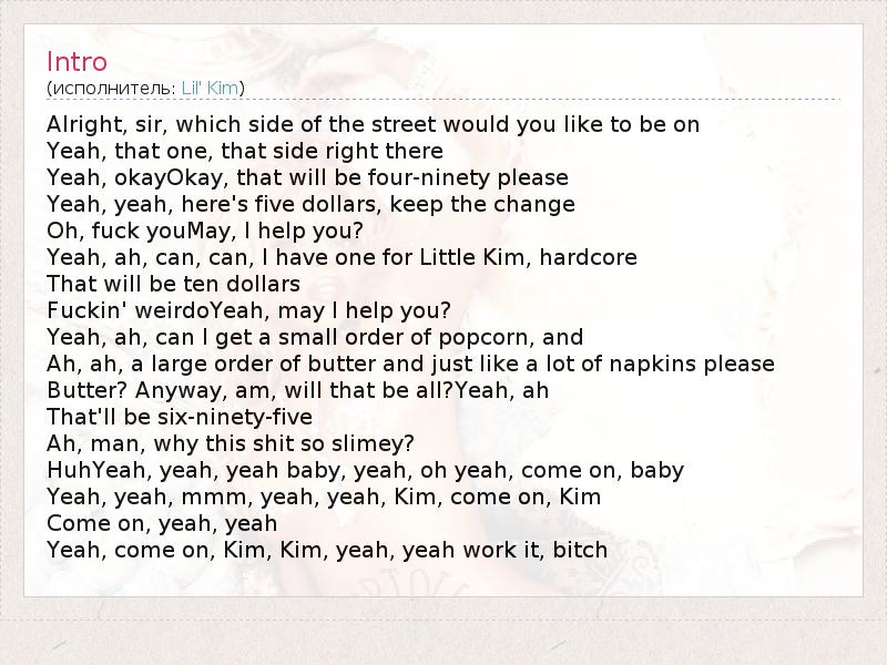 Alright, sir, which side of the street would you like to be on Yeah, that one, that side right there Yeah, okayOkay, that will be four-ninety please Yeah, yeah, here's five dollars, keep the change Oh, fuck youMay, I help you? Yeah, ah, can, can, I have one for Little Kim, hardcore That will be ten dollars Fuckin' weirdoYeah, may I help you? Yeah, ah, can I get a small order of popcorn, and Ah, ah, a large order of butter and just like a lot of napkins please Butter? Anyway, am, will that be all?Yeah, ah That'll be six-ninety-five Ah, man, why this shit so slimey? HuhYeah, yeah, yeah baby, yeah, oh yeah, come on, baby Yeah, yeah, mmm, yeah, yeah, Kim, come on, Kim Come on, yeah, yeah Yeah, come on, Kim, Kim, yeah, yeah work it, bitch