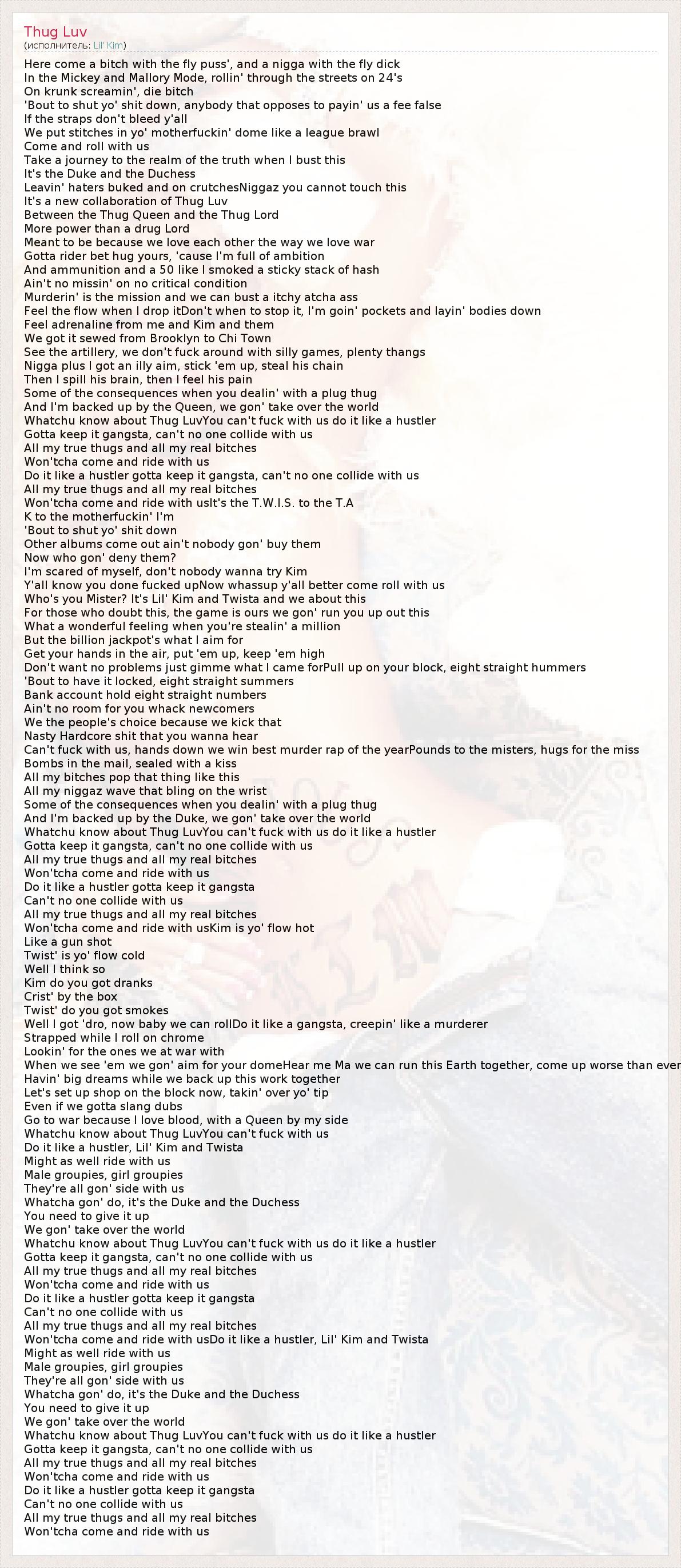 Here come a bitch with the fly puss', and a nigga with the fly dick In the Mickey and Mallory Mode, rollin' through the streets on 24's On krunk screamin', die bitch 'Bout to shut yo' shit down, anybody that opposes to payin' us a fee false If the straps don't bleed y'all We put stitches in yo' motherfuckin' dome like a league brawl Come and roll with us Take a journey to the realm of the truth when I bust this It's the Duke and the Duchess Leavin' haters buked and on crutchesNiggaz you cannot touch this It's a new collaboration of Thug Luv Between the Thug Queen and the Thug Lord More power than a drug Lord Meant to be because we love each other the way we love war Gotta rider bet hug yours, 'cause I'm full of ambition And ammunition and a 50 like I smoked a sticky stack of hash Ain't no missin' on no critical condition Murderin' is the mission and we can bust a itchy atcha ass Feel the flow when I drop itDon't when to stop it, I'm goin' pockets and layin' bodies down Feel adrenaline from me and Kim and them We got it sewed from Brooklyn to Chi Town See the artillery, we don't fuck around with silly games, plenty thangs Nigga plus I got an illy aim, stick 'em up, steal his chain Then I spill his brain, then I feel his pain Some of the consequences when you dealin' with a plug thug And I'm backed up by the Queen, we gon' take over the world Whatchu know about Thug LuvYou can't fuck with us do it like a hustler Gotta keep it gangsta, can't no one collide with us All my true thugs and all my real bitches Won'tcha come and ride with us Do it like a hustler gotta keep it gangsta, can't no one collide with us All my true thugs and all my real bitches Won'tcha come and ride with usIt's the T.W.I.S. to the T.A K to the motherfuckin' I'm 'Bout to shut yo' shit down Other albums come out ain't nobody gon' buy them Now who gon' deny them? I'm scared of myself, don't nobody wanna try Kim Y'all know you done fucked upNow whassup y'all better come roll with us Who's you Mister? It's Lil' Kim and Twista and we about this For those who doubt this, the game is ours we gon' run you up out this What a wonderful feeling when you're stealin' a million But the billion jackpot's what I aim for Get your hands in the air, put 'em up, keep 'em high Don't want no problems just gimme what I came forPull up on your block, eight straight hummers 'Bout to have it locked, eight straight summers Bank account hold eight straight numbers Ain't no room for you whack newcomers We the people's choice because we kick that Nasty Hardcore shit that you wanna hear Can't fuck with us, hands down we win best murder rap of the yearPounds to the misters, hugs for the miss Bombs in the mail, sealed with a kiss All my bitches pop that thing like this All my niggaz wave that bling on the wrist Some of the consequences when you dealin' with a plug thug And I'm backed up by the Duke, we gon' take over the world Whatchu know about Thug LuvYou can't fuck with us do it like a hustler Gotta keep it gangsta, can't no one collide with us All my true thugs and all my real bitches Won'tcha come and ride with us Do it like a hustler gotta keep it gangsta Can't no one collide with us All my true thugs and all my real bitches Won'tcha come and ride with usKim is yo' flow hot Like a gun shot Twist' is yo' flow cold Well I think so Kim do you got dranks Crist' by the box Twist' do you got smokes Well I got 'dro, now baby we can rollDo it like a gangsta, creepin' like a murderer Strapped while I roll on chrome Lookin' for the ones we at war with When we see 'em we gon' aim for your domeHear me Ma we can run this Earth together, come up worse than ever Havin' big dreams while we back up this work together Let's set up shop on the block now, takin' over yo' tip Even if we gotta slang dubs Go to war because I love blood, with a Queen by my side Whatchu know about Thug LuvYou can't fuck with us Do it like a hustler, Lil' Kim and Twista Might as well ride with us Male groupies, girl groupies They're all gon' side with us Whatcha gon' do, it's the Duke and the Duchess You need to give it up We gon' take over the world Whatchu know about Thug LuvYou can't fuck with us do it like a hustler Gotta keep it gangsta, can't no one collide with us All my true thugs and all my real bitches Won'tcha come and ride with us Do it like a hustler gotta keep it gangsta Can't no one collide with us All my true thugs and all my real bitches Won'tcha come and ride with usDo it like a hustler, Lil' Kim and Twista Might as well ride with us Male groupies, girl groupies They're all gon' side with us Whatcha gon' do, it's the Duke and the Duchess You need to give it up We gon' take over the world Whatchu know about Thug LuvYou can't fuck with us do it like a hustler Gotta keep it gangsta, can't no one collide with us All my true thugs and all my real bitches Won'tcha come and ride with us Do it like a hustler gotta keep it gangsta Can't no one collide with us All my true thugs and all my real bitches Won'tcha come and ride with us