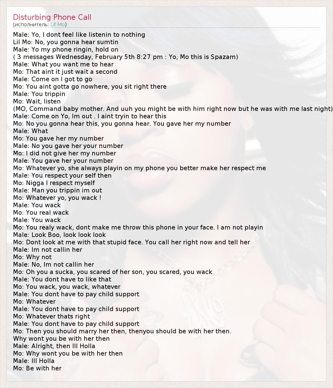 Male: Yo, I dont feel like listenin to nothing Lil Mo: No, you gonna hear sumtin Male: Yo my phone ringin, hold on ( 3 messages Wednesday, February 5th 8:27 pm : Yo, Mo this is Spazam) Male: What you want me to hear Mo: That aint it just wait a second Male: Come on I got to go Mo: You aint gotta go nowhere, you sit right there Male: You trippin Mo: Wait, listen (MO, Command baby mother. And uuh you might be with him right now but he was with me last night) Male: Come on Yo, Im out . I aint tryin to hear this Mo: No you gonna hear this, you gonna hear. You gave her my number Male: What Mo: You gave her my number Male: No you gave her your number Mo: I did not give her my number Male: You gave her your number Mo: Whatever yo, she always playin on my phone you better make her respect me Male: You respect your self then Mo: Nigga I respect myself Male: Man you trippin im out Mo: Whatever yo, you wack ! Male: You wack Mo: You real wack Male: You wack Mo: You realy wack, dont make me throw this phone in your face. I am not playin Male: Look Boo, look look look Mo: Dont look at me with that stupid face. You call her right now and tell her Male: Im not callin her Mo: Why not Male: No, Im not callin her Mo: Oh you a sucka, you scared of her son, you scared, you wack Male: You dont have to like that Mo: You wack, you wack, whatever Male: You dont have to pay child support Mo: Whatever Male: You dont have to pay child support Mo: Whatever thats right Male: You dont have to pay child support Mo: Then you should marry her then, thenyou should be with her then. Why wont you be with her then Male: Alright, then Ill Holla Mo: Why wont you be with her then Male: Ill Holla Mo: Be with her