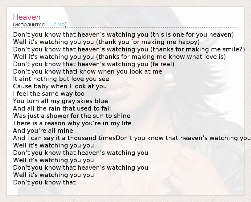 Don't you know that heaven's watching you (this is one for you heaven) Well it's watching you you (thank you for making me happy) Don't you know that heaven's watching you (thanks for making me smile?) Well it's watching you you (thanks for making me know what love is) Don't you know that heaven's watching you (fa real) Don't you know thatI know when you look at me It aint nothing but love you see Cause baby when I look at you I feel the same way too You turn all my gray skies blue And all the rain that used to fall Was just a shower for the sun to shine There is a reason why you're in my life And you're all mine And I can say it a thousand timesDon't you know that heaven's watching you Well it's watching you you Don't you know that heaven's watching you Well it's watching you you Don't you know that heaven's watching you Well it's watching you you Don't you know that