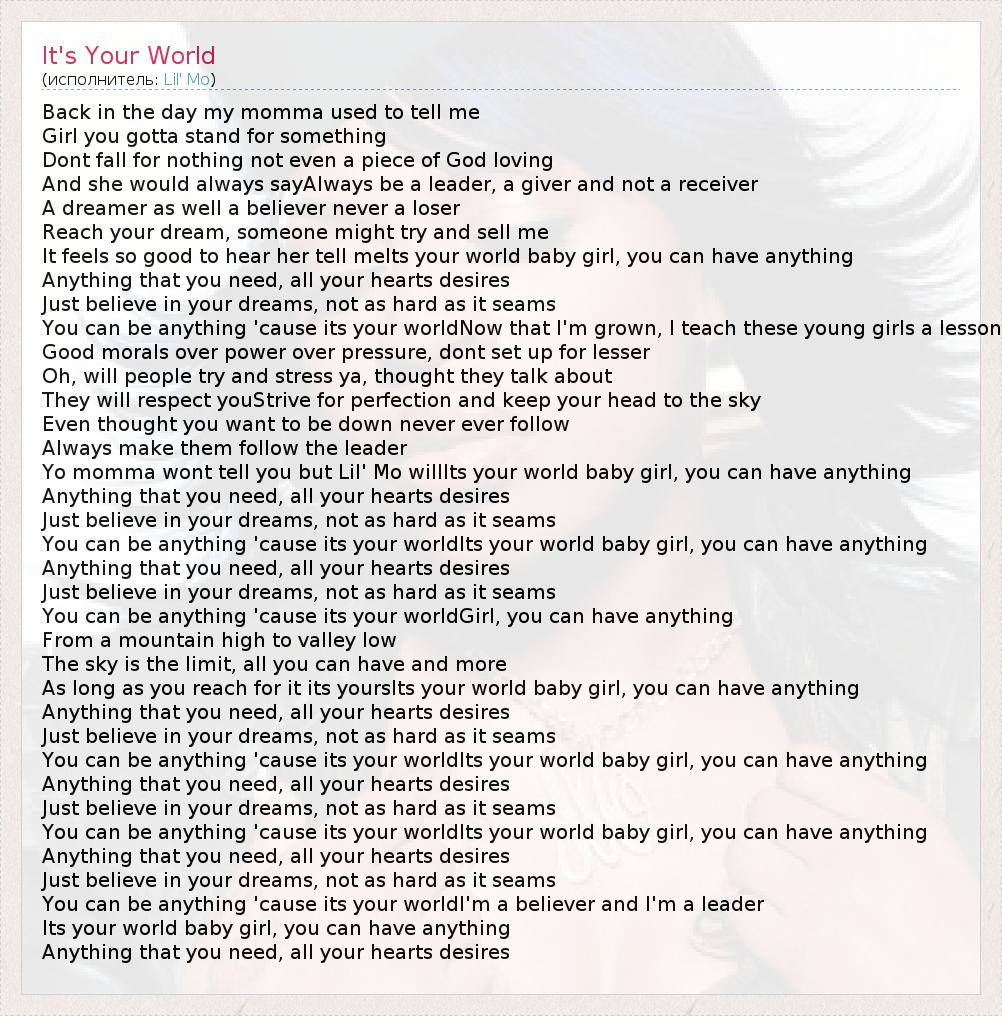 Yo momma wont tell you but Lil' Mo willIts your world baby girl, you can have anything