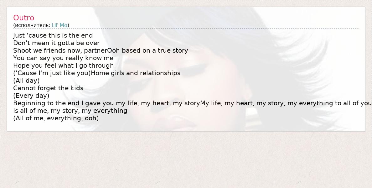 Это интересно:Cynthia Loving (born July 3, 1978), also known by her stage name Lil' Mo, is an American R&B singer and songwriter. She is best known for collaborating with artists such as Ja Rule, Missy Elliott, Ol' Dirty Bastard and Fabolous, and for her hit single "Superwoman Pt. II."Born into a military family, Loving was raised primarily on Long Island, but moved about regularly as her family followed her father's military assignments. Along with her parents, Bishop Jacob and First-Lady Cynthia Loving Sr., she lived in Texas, Atlanta, Georgia, and Fayetteville, North Carolina before settling in Baltimore, Maryland. Dreams of becoming a famous singer began early and she always... продолжение